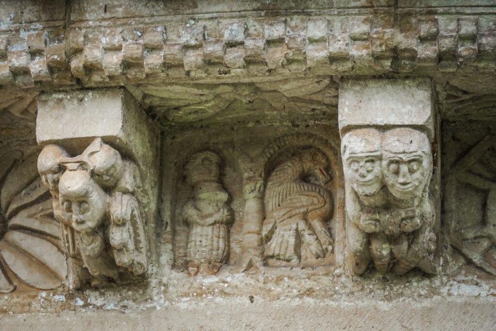 La portada meridional es, sin duda, su pieza más singular. Allí aparece una de las escenas más evocadoras del románico asturiano: la despedida de un caballero a caballo y una dama que lo besa antes de partir. Riendas, halcón, castillos y combates completan un relato esculpido que mezcla mundo feudal y mensaje moral, y que conecta este templo con otros grandes conjuntos románicos del noroeste y del sur de Francia.