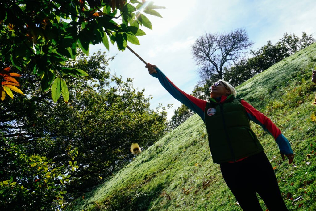Entre preguntas y descubrimientos, el camino va avanzando y aparecen las castañas. Cuando ya tiene un puñado, surge la duda: «¿Dónde se echan?».
