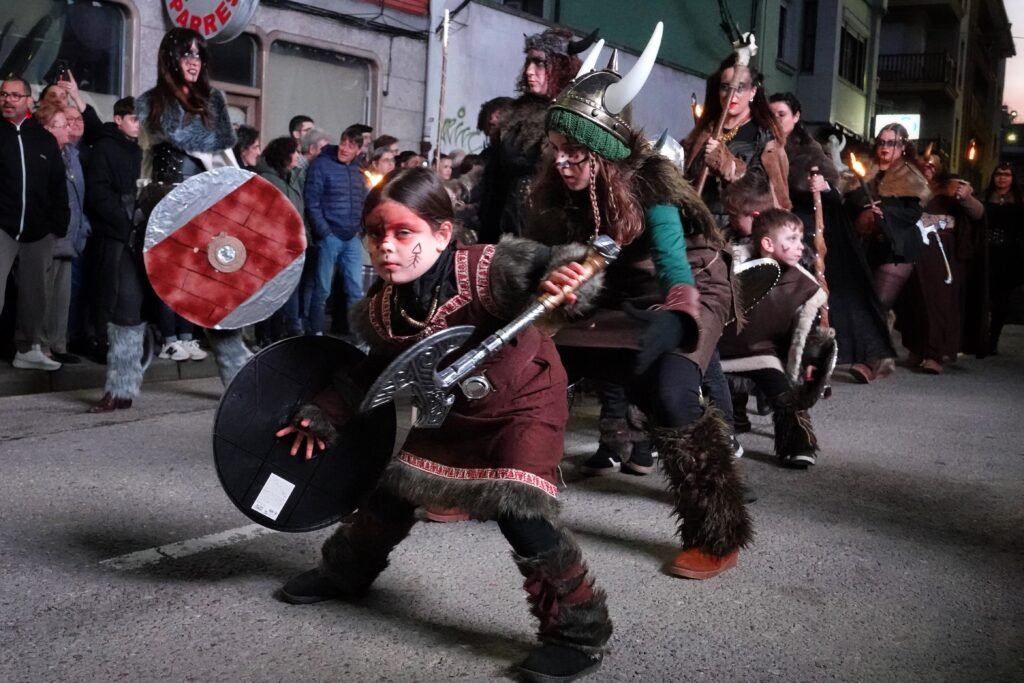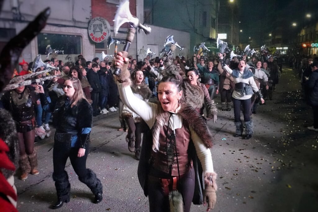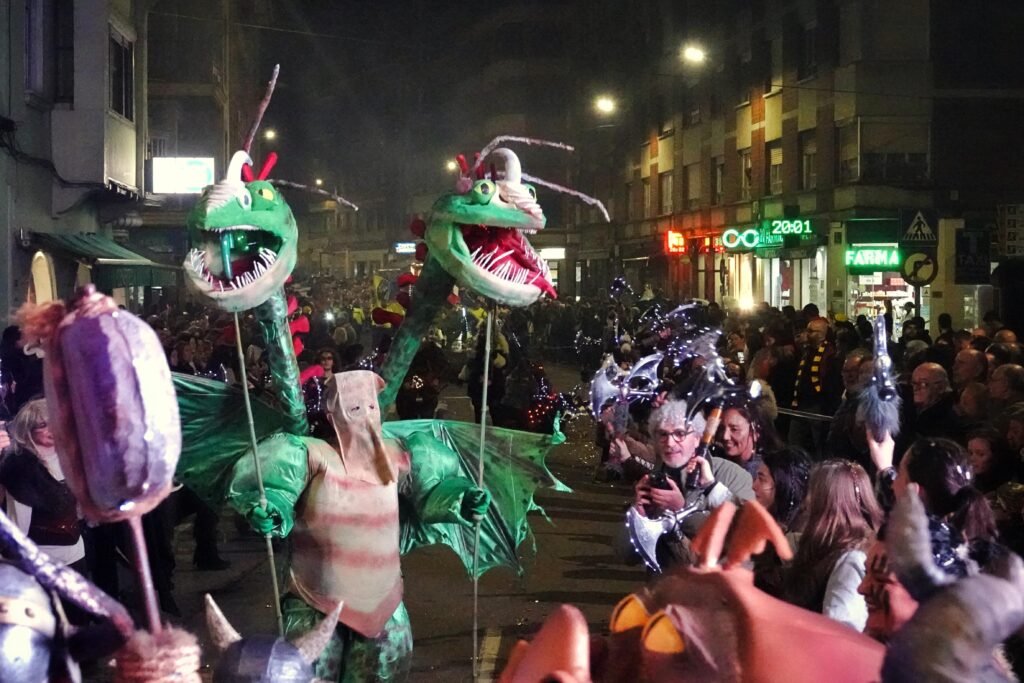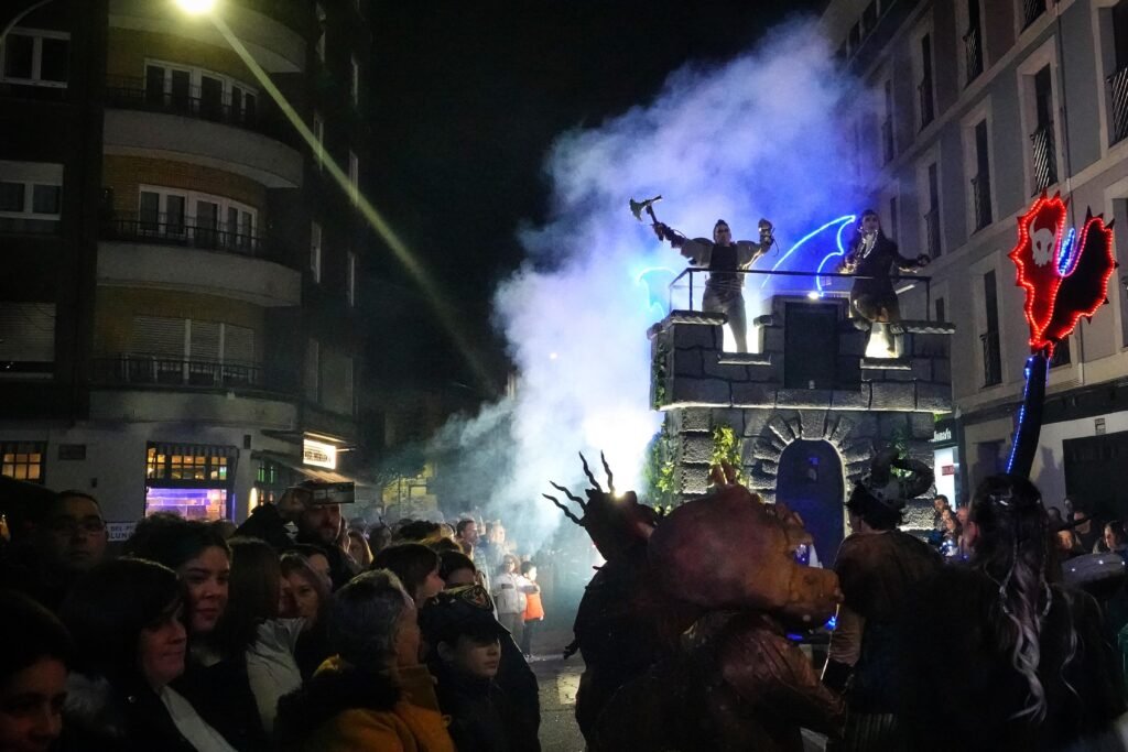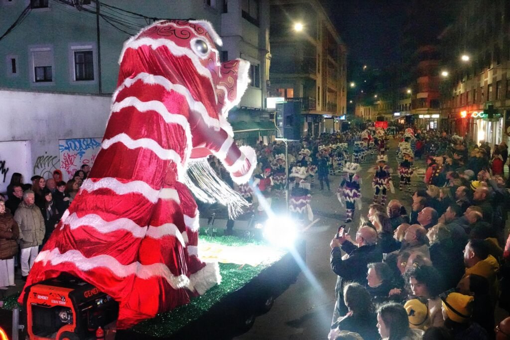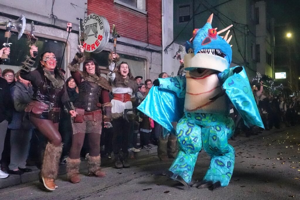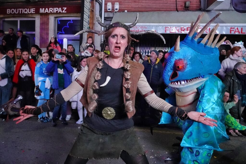 Entre los grupos más celebrados desfiló Xente Xoven, procedente de Gijón. Setenta integrantes y un espectáculo, ‘Serín, donde nacen los dragones’, inspirado en Cómo entrenar a tu dragón, con el que desplegaron alas, escamas y coreografías de fuego imaginario. Su puesta en escena —pulida en premios recientes en Luarca, Gijón o Mieres— provocó uno de los aplausos más largos del recorrido.