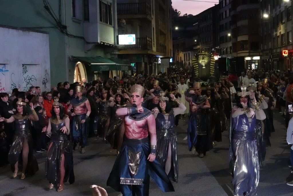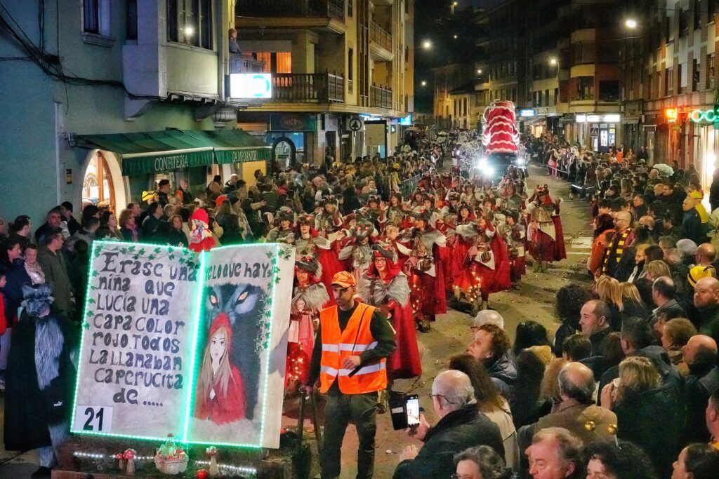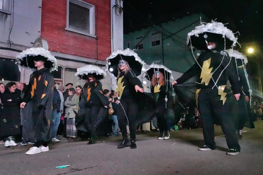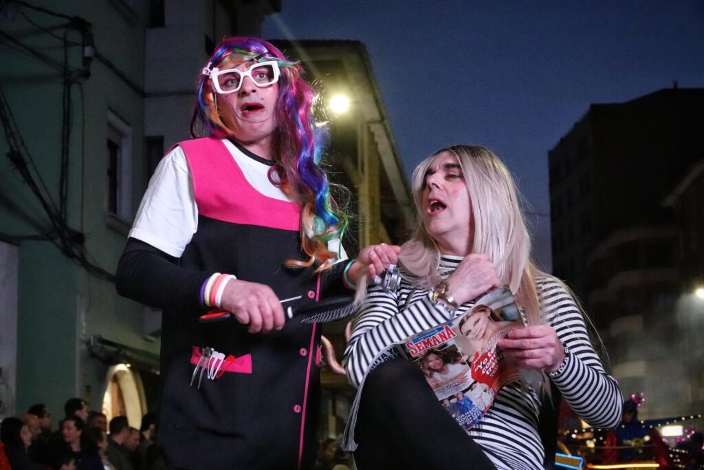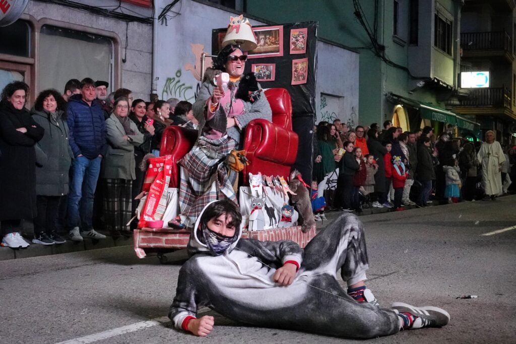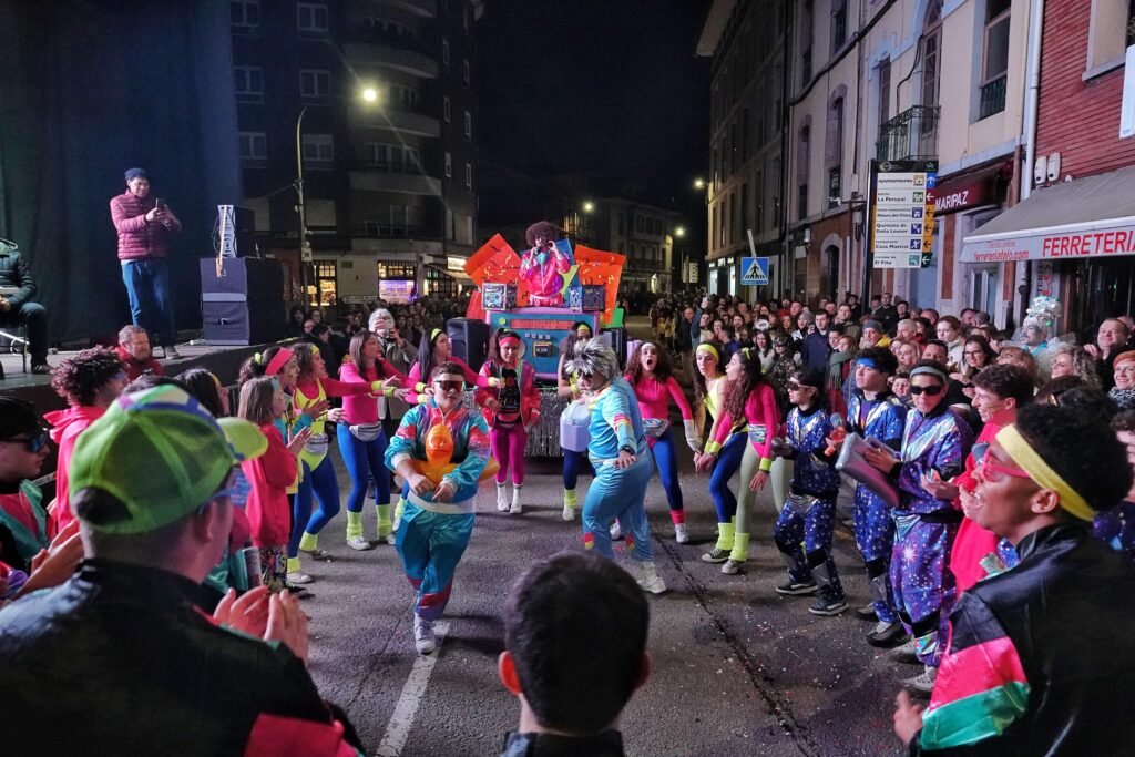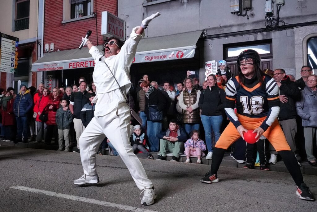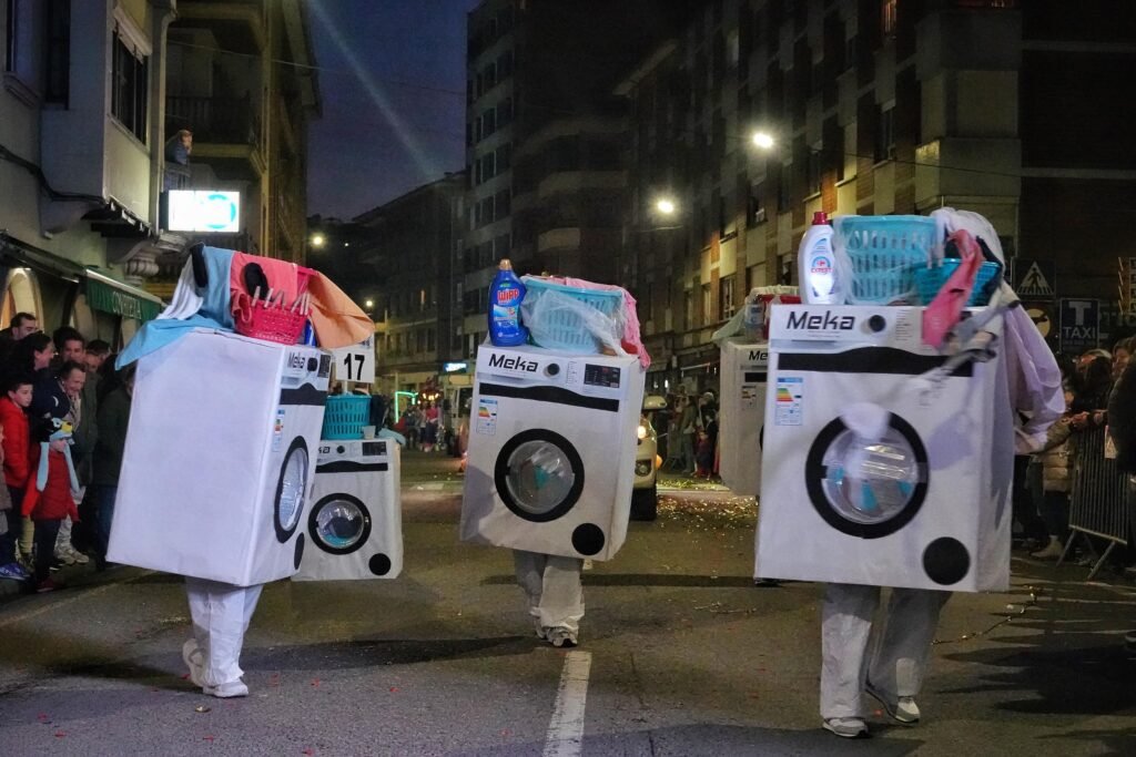 El desfile fue, como manda la tradición, un mosaico de épocas y mundos. Un grupo local de veinte personas viajó a los años ochenta entre hombreras y neones; desde Ribadesella llegó un autolavado humano en clave de espectáculo, con 25 participantes convertidos en rodillos y espuma. Y, entre medias, hadas, Caperucita y el lobo, tribus masáis, dioses egipcios, antroxaos, madreñogiros y sátiras de actualidad.