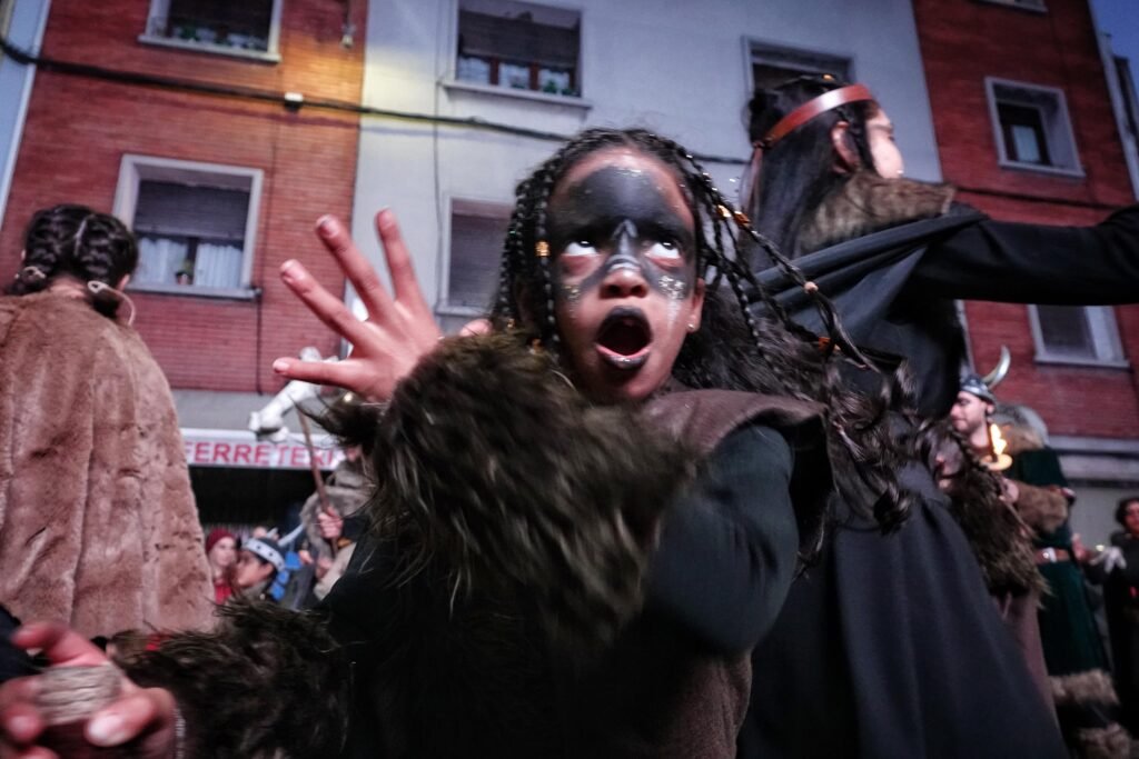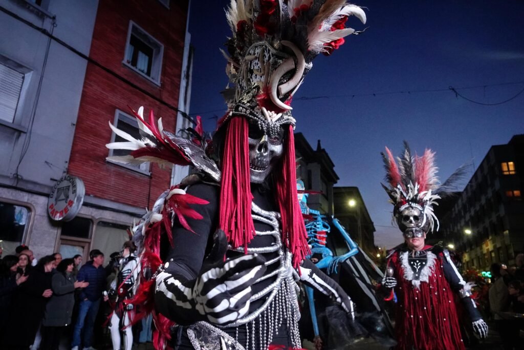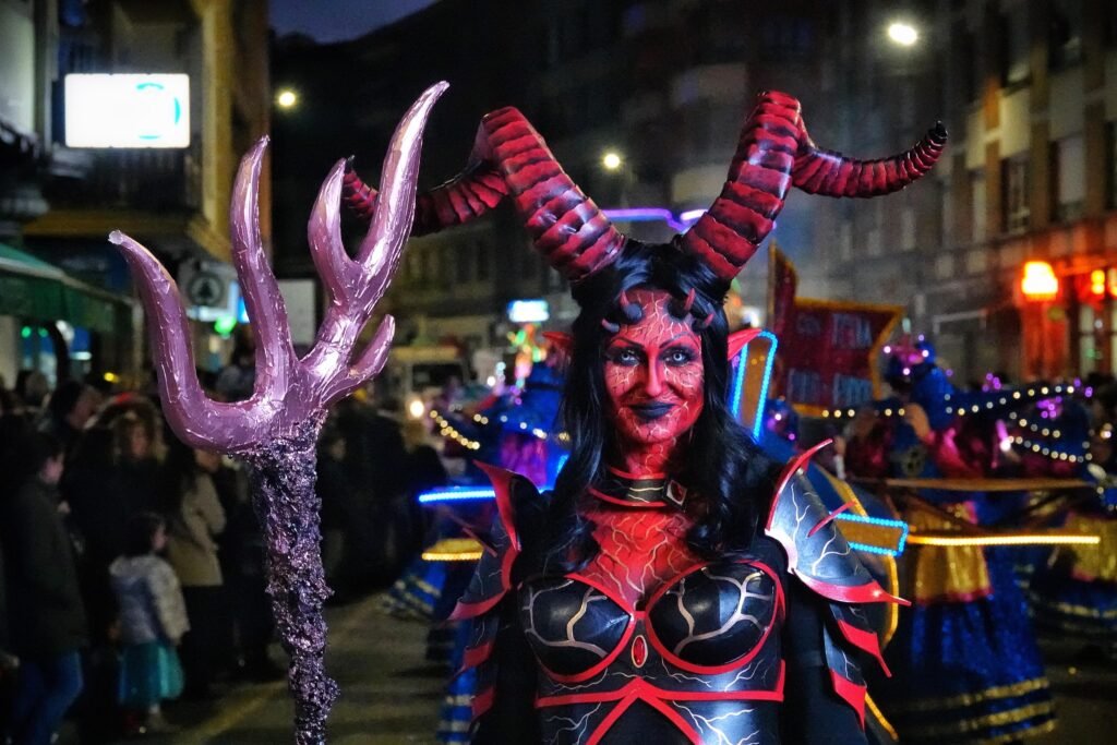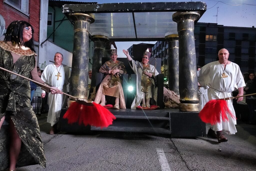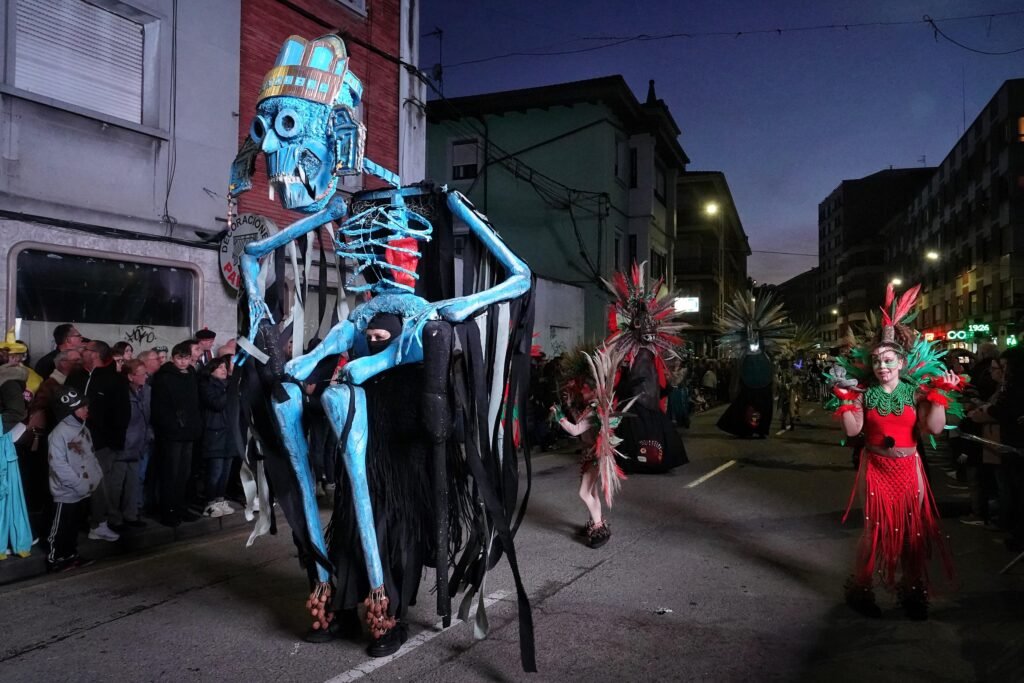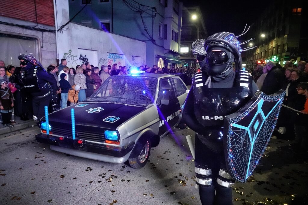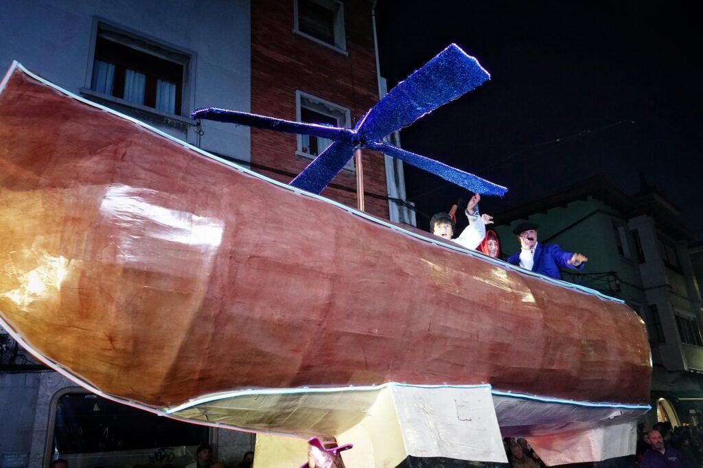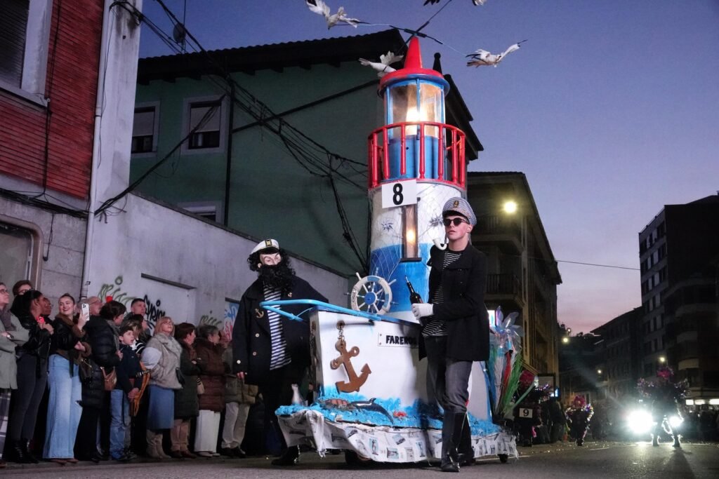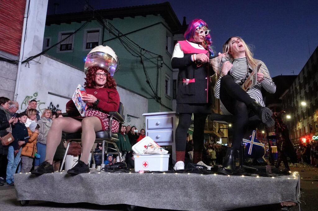 El desfile fue, como manda la tradición, un mosaico de épocas y mundos. Un grupo local de veinte personas viajó a los años ochenta entre hombreras y neones; desde Ribadesella llegó un autolavado humano en clave de espectáculo, con 25 participantes convertidos en rodillos y espuma. Y, entre medias, hadas, Caperucita y el lobo, tribus masáis, dioses egipcios, antroxaos, madreñogiros y sátiras de actualidad.