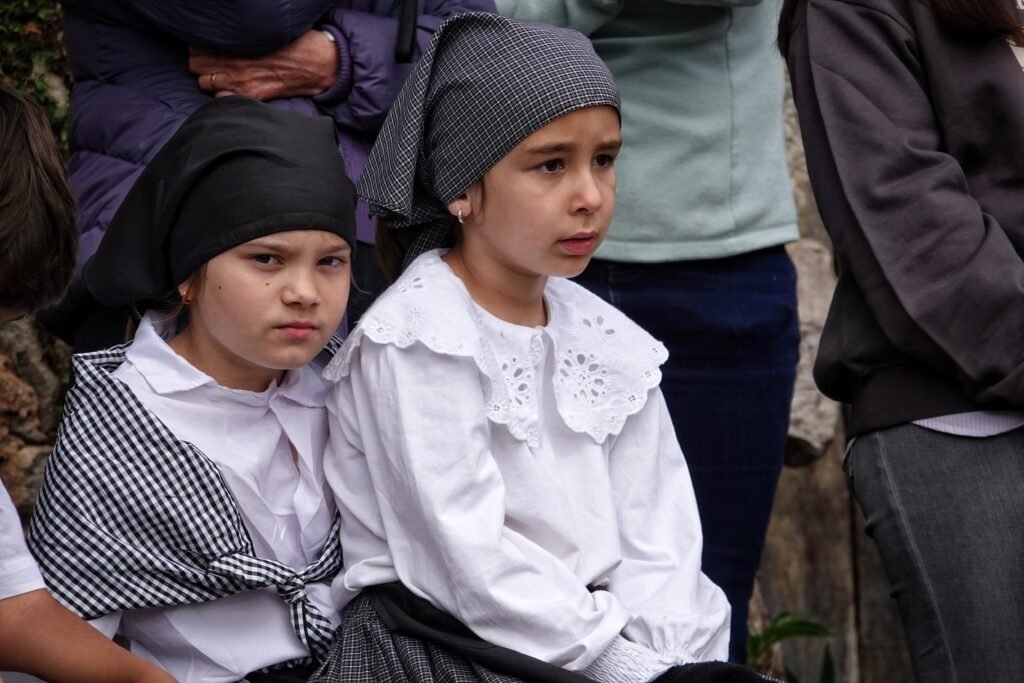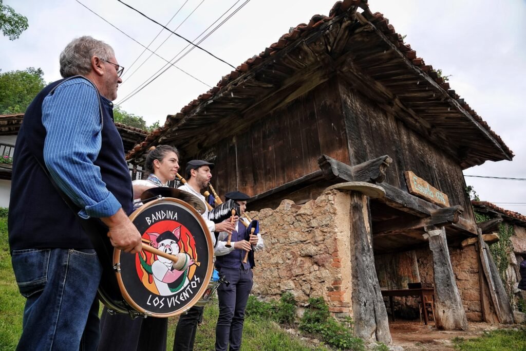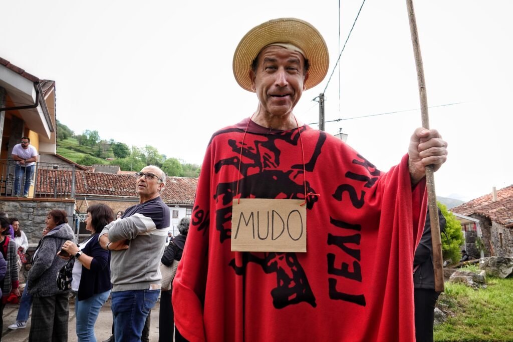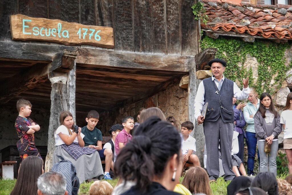 Desde primera hora de la mañana, la plaza se llenó de expectación. Allí, bajo un hórreo que fue la primera aula del pueblo hace 250 años, arrancó una propuesta que superó todas las previsiones: un recorrido teatralizado guiado por un maestro que condujo a la comitiva a través de distintos momentos clave de la historia de Asiegu, desde los tiempos más antiguos hasta una mirada proyectada hacia el futuro.