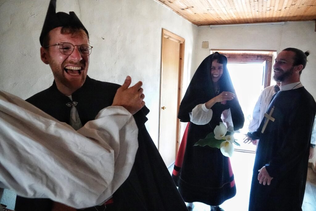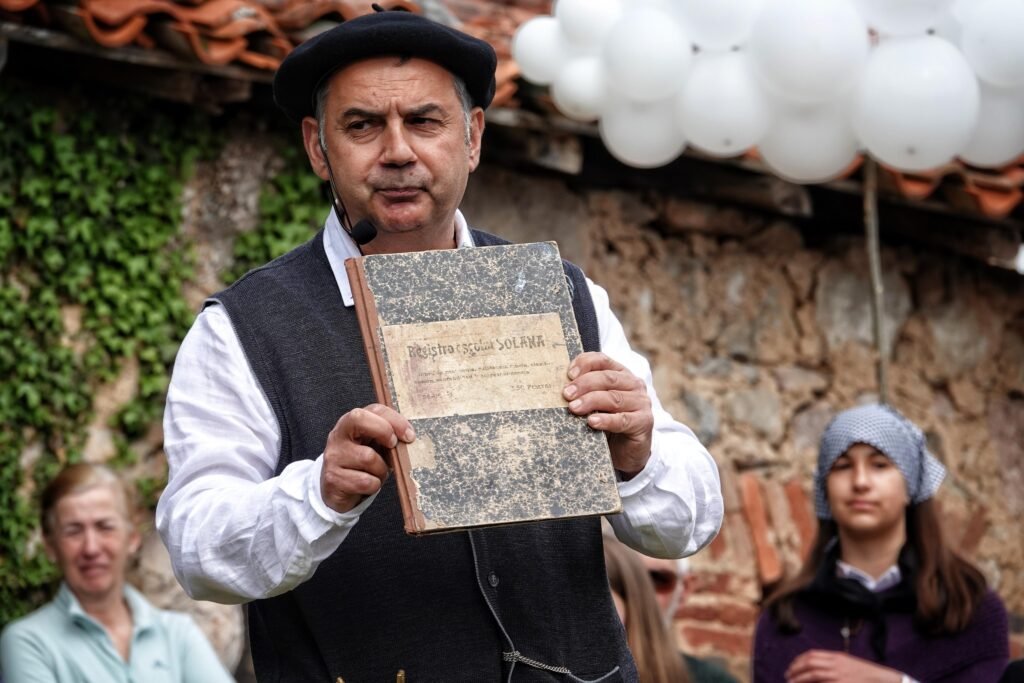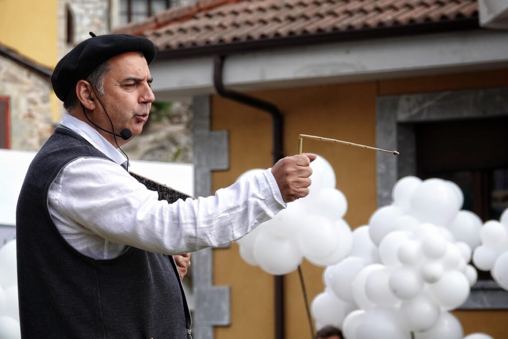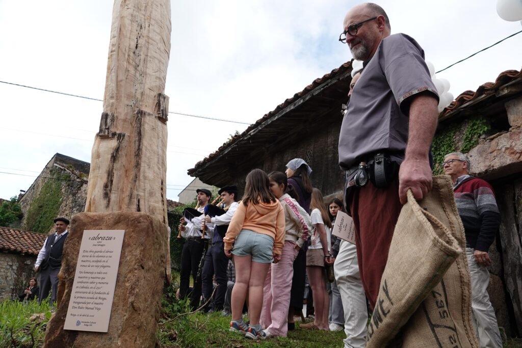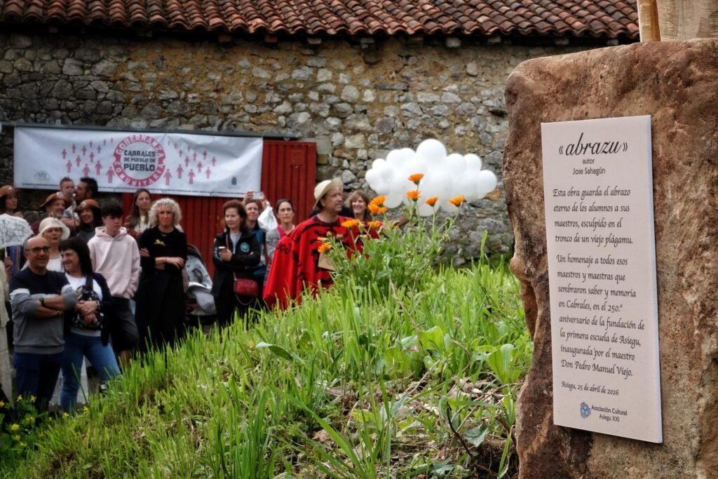 Desde primera hora de la mañana, la plaza se llenó de expectación. Allí, bajo un hórreo que fue la primera aula del pueblo hace 250 años, arrancó una propuesta que superó todas las previsiones: un recorrido teatralizado guiado por un maestro que condujo a la comitiva a través de distintos momentos clave de la historia de Asiegu, desde los tiempos más antiguos hasta una mirada proyectada hacia el futuro.