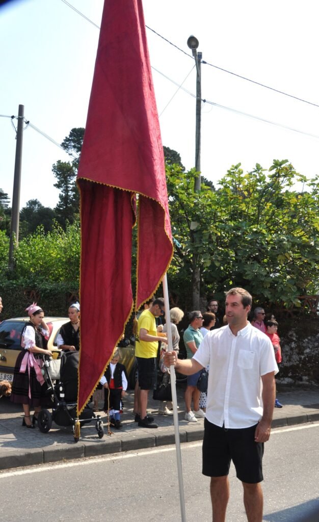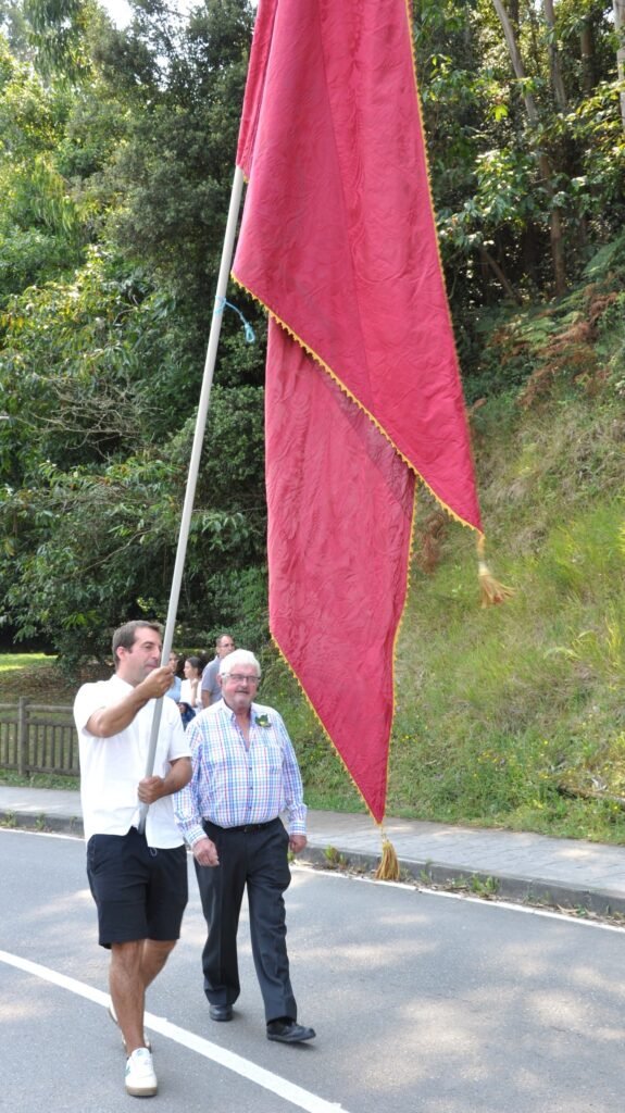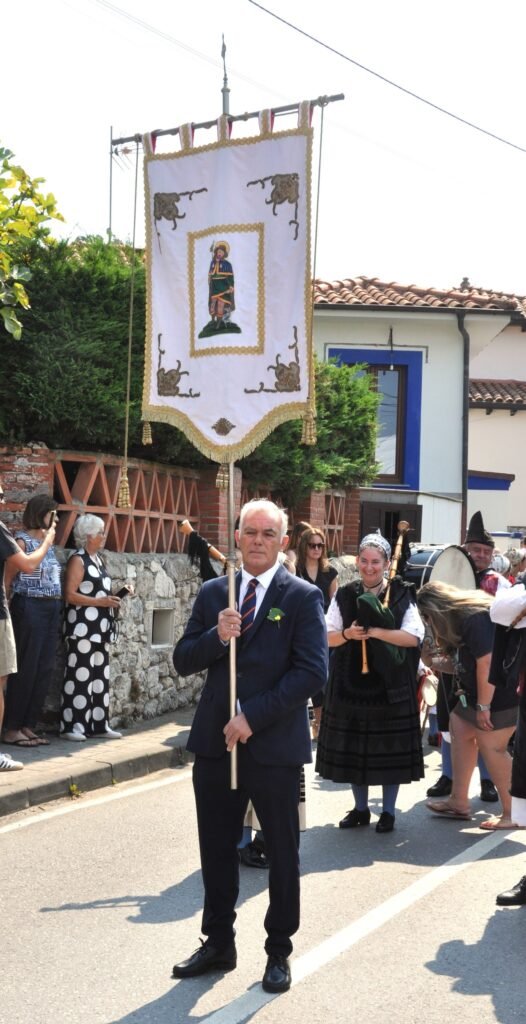 Encabezaba la comitiva el Pendón de Barro, una enorme tela roja que lleva más de doscientos años saliendo a la procesión. De su traslado se encargaba el joven Gorka Azárate Cue, aleccionado previamente por el insustituible Joaquín de la Vega ‘Chocolate’. Por detrás venía el estandarte de San Roque y la banda de gaitas L’Alloru, de Balmori, dirigida por Julián Herrero. Seguía un ramo mixto, de pan dulce y artesanal, que entre sus adornos llevaba llamativas hojas de la planta de maíz, fuente de vida y alimento durante muchos años en el entorno rural llanisco.