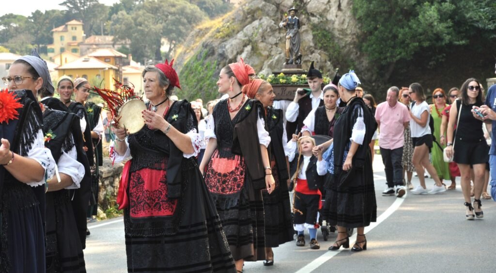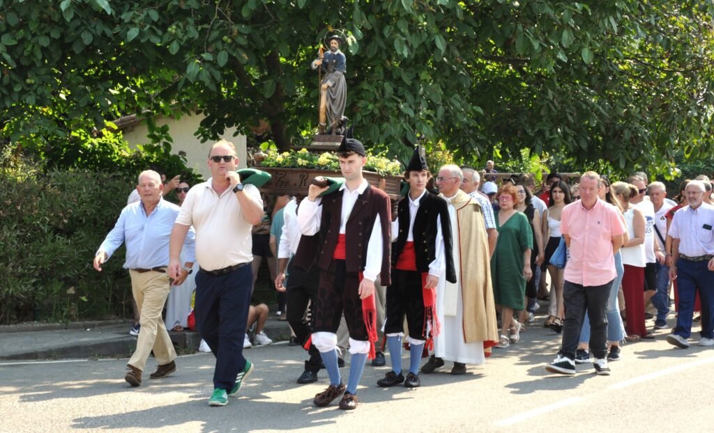 De regreso al pueblo, la zona de la capilla era punto de reunión de la comitiva procesional en dirección a la cercana iglesia de Nuestra Señora de los Dolores. Era fácil confirmar que allí se había agrupado mucha gente. Entre los asistentes estaba una representación de San Roque de Llanes, que eran portadores de la Reliquia, un trozo de la tibia del santo que llegó a Llanes, desde Montpellier, en el año 1925, gracias a la gestión realizada por el matrimonio formado por Ricardo Teresa Robles y Concepción Fernández ‘Conchita’.