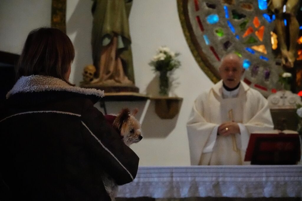 A mediodía se celebró una concurrida misa cantada por el coro parroquial y oficiada por el párroco Florentino Hoyos, asistido por el eficaz monaguillo Miguel García Pidal. Tras la eucaristía, sacerdote y acólito salieron a la plazuela del templo para derramar generosas gotas de agua bendita sobre los animales y sus dueños.