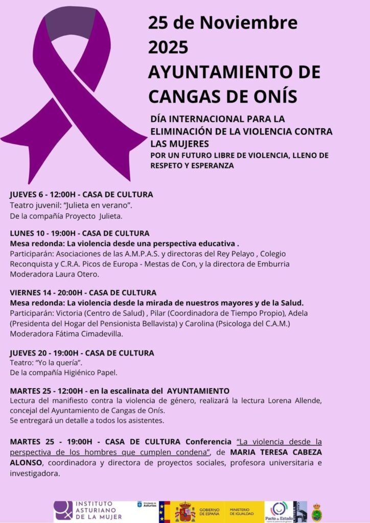 El Ayuntamiento de Cangas de Onís se suma a la conmemoración del Día Internacional para la Eliminación de la Violencia contra las Mujeres, el 25 de noviembre de 2025, con una completa programación de actividades que se desarrollará a lo largo de todo el mes. El objetivo es sensibilizar a la ciudadanía y promover la igualdad y el respeto desde diferentes ámbitos: educativo, social, cultural y sanitario.