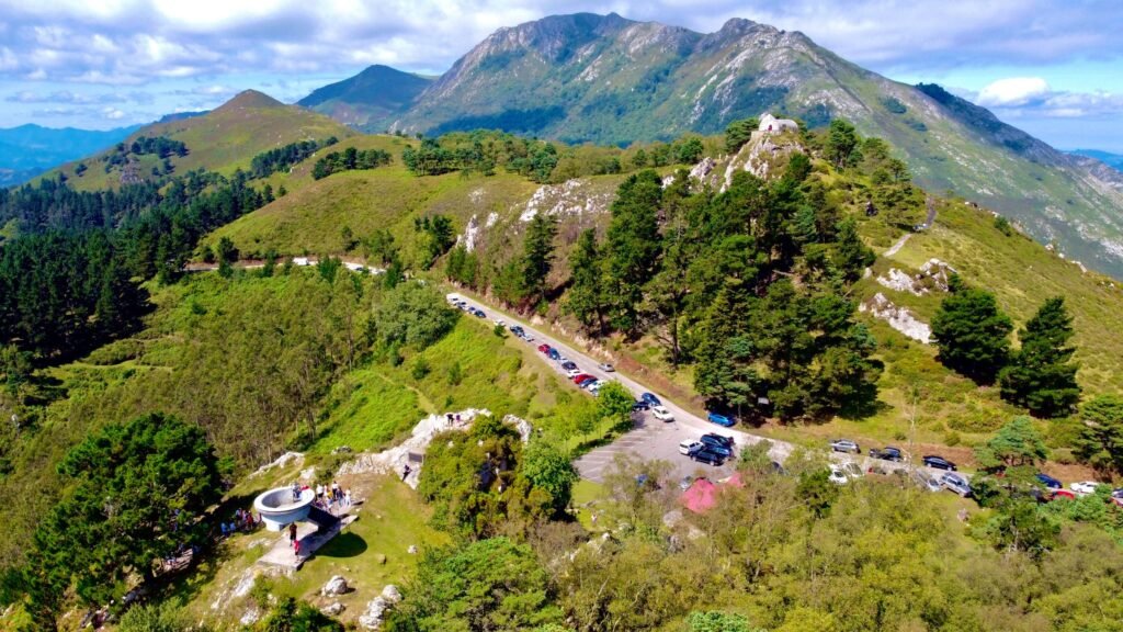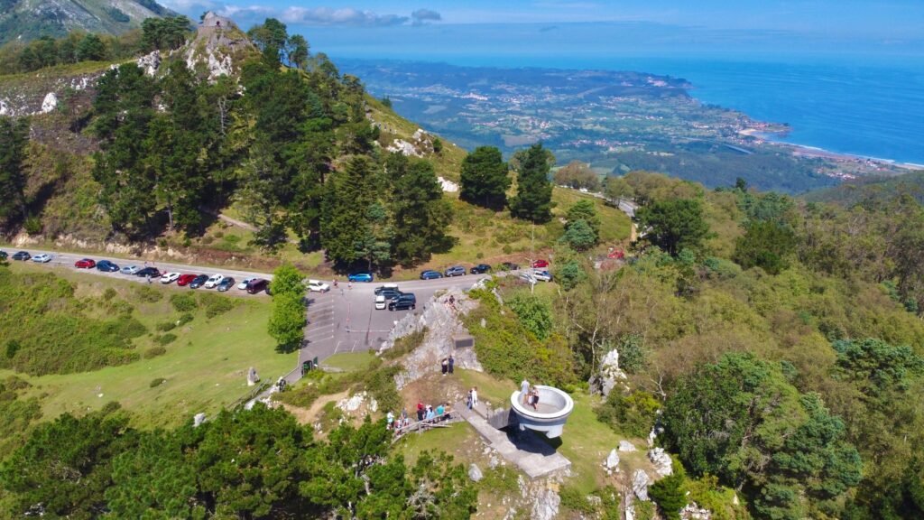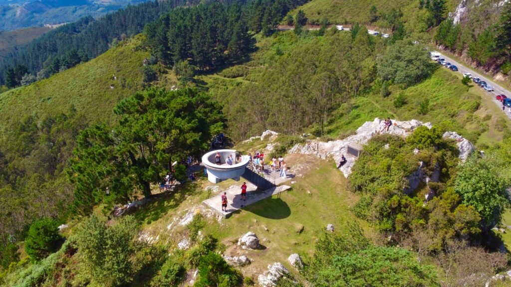 El Mirador del Fitu se alza a 597 metros de altitud. La estructura de hormigón, inaugurada en 1927, tiene algo de mirador alpino trasladado al norte atlántico. Se aparca junto a la carretera y, tras unos pasos, la plataforma circular revela el motivo del ascenso.