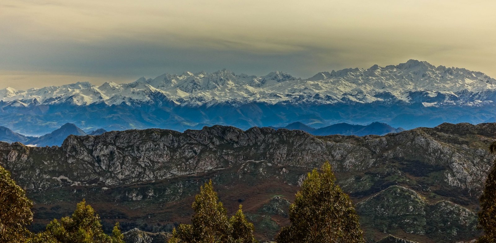 Desde arriba, el paisaje gira en 360 grados. La Sierra del Sueve envuelve el mirador y despliega su relieve ondulado, territorio de pastos altos y nieblas cambiantes. Hacia el sur, la silueta de los Picos de Europa se recorta en días despejados con una nitidez inesperada.