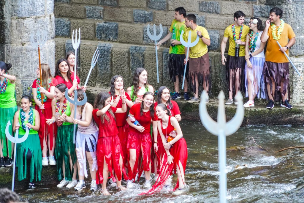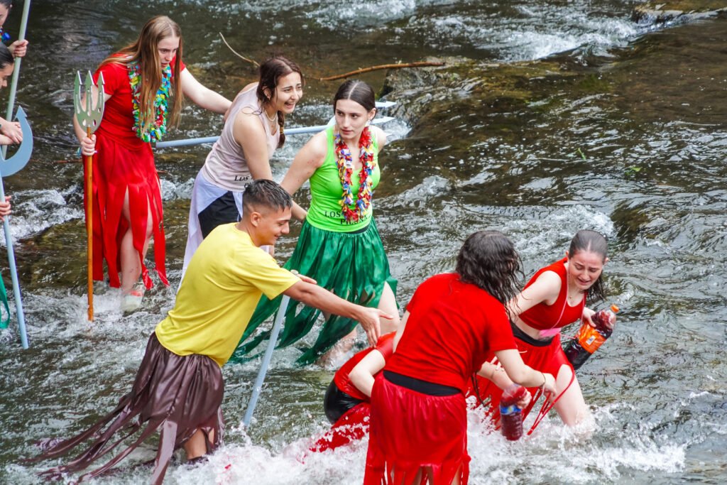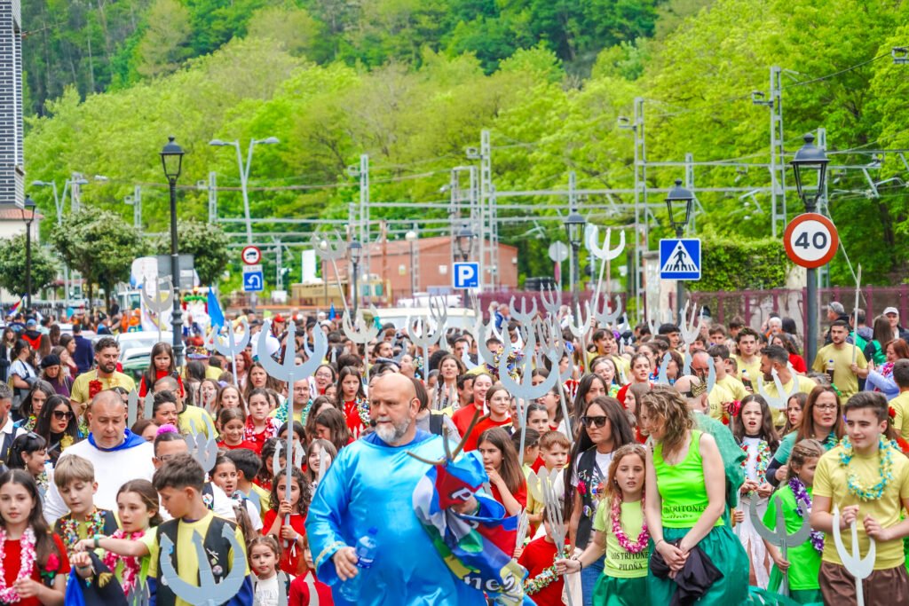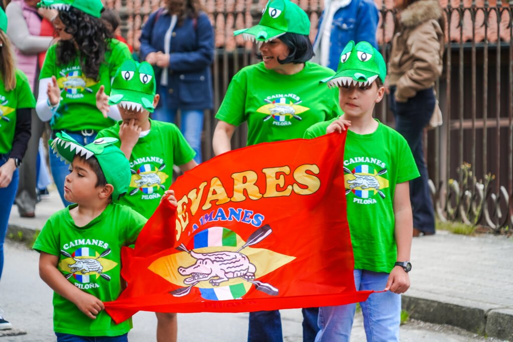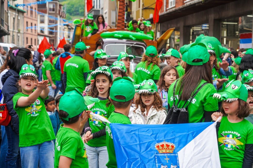 Jugando en casa, Los Tritones, capitaneados por Kevi Menéndez, desplegaron su habitual energía, cumpliendo con su doble cometido de animar las calles y velar por el río. A su estela desfilaron otros grupos del concejo como El Roblón de Coya, Los Caimanes de Sevares o los vecinos de Villamayor.