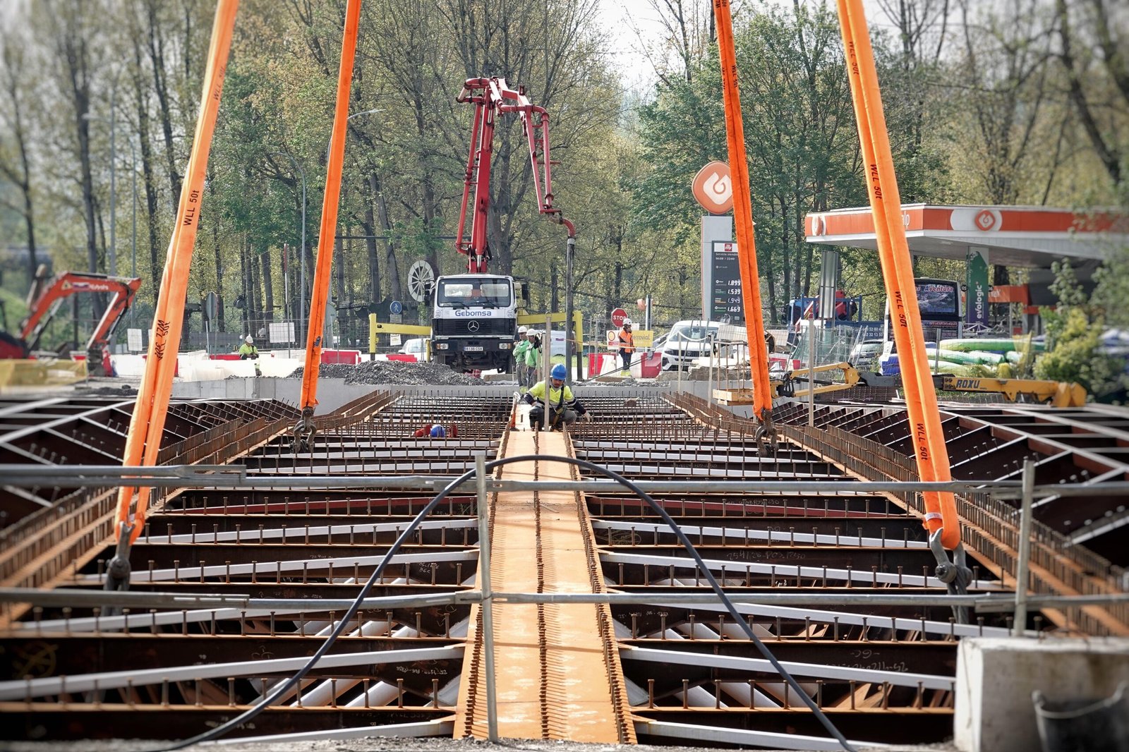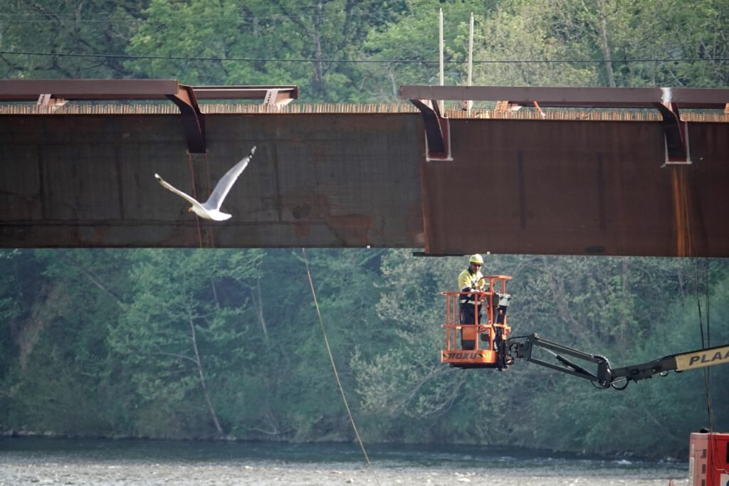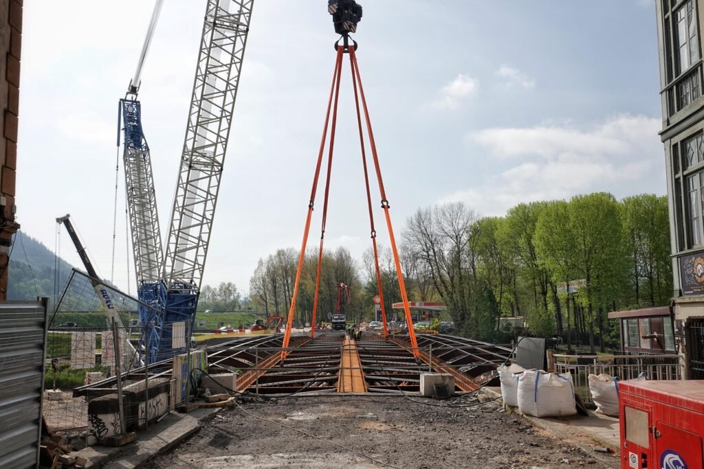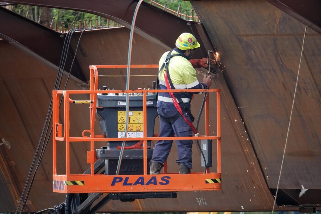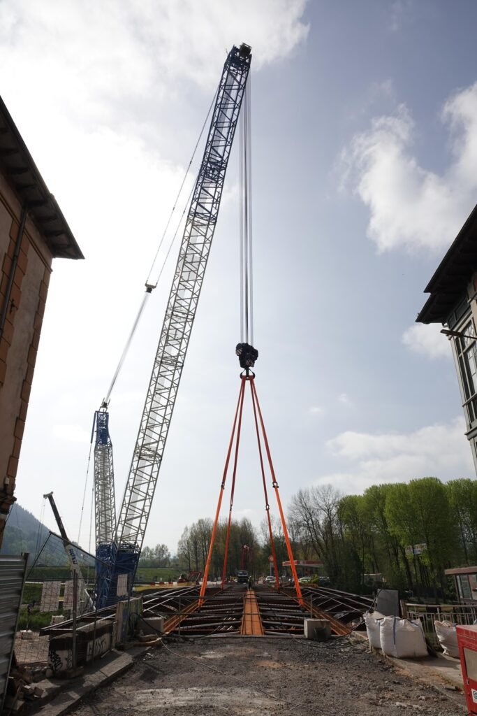 La protagonista de la jornada fue la segunda de las vigas cajón metálicas: 41,5 metros de longitud y cerca de 100 toneladas de peso que, elevadas por una grúa de 600 toneladas, fueron colocadas en su posición para completar la estructura iniciada el jueves.