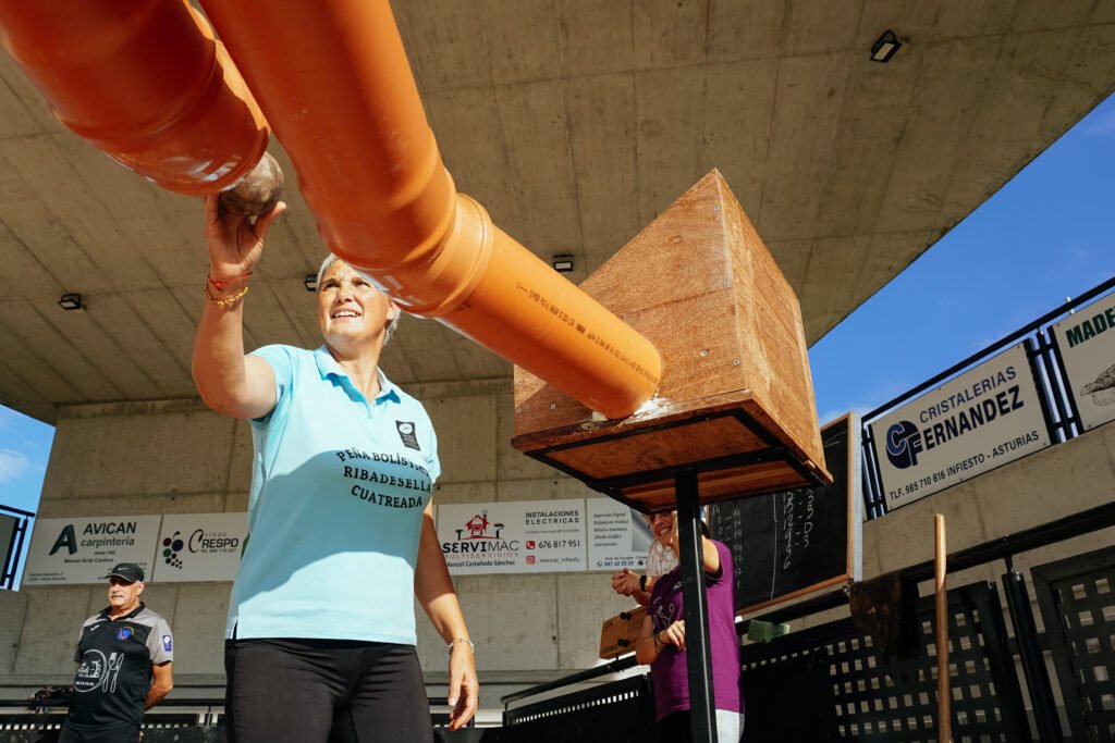 Los bolos en la variedad de cuatreada –la más popular y la jugada en este caso-son «precisión y estrategia» y para jugadoras como Isabel Casado una «joya» a conservar frente a juegos de fuera. «Resulta que vamos a Parque Principado a pagar por los bolos americanos y tenemos aquí esto, que es gratis y que es nuestro», evidencia.