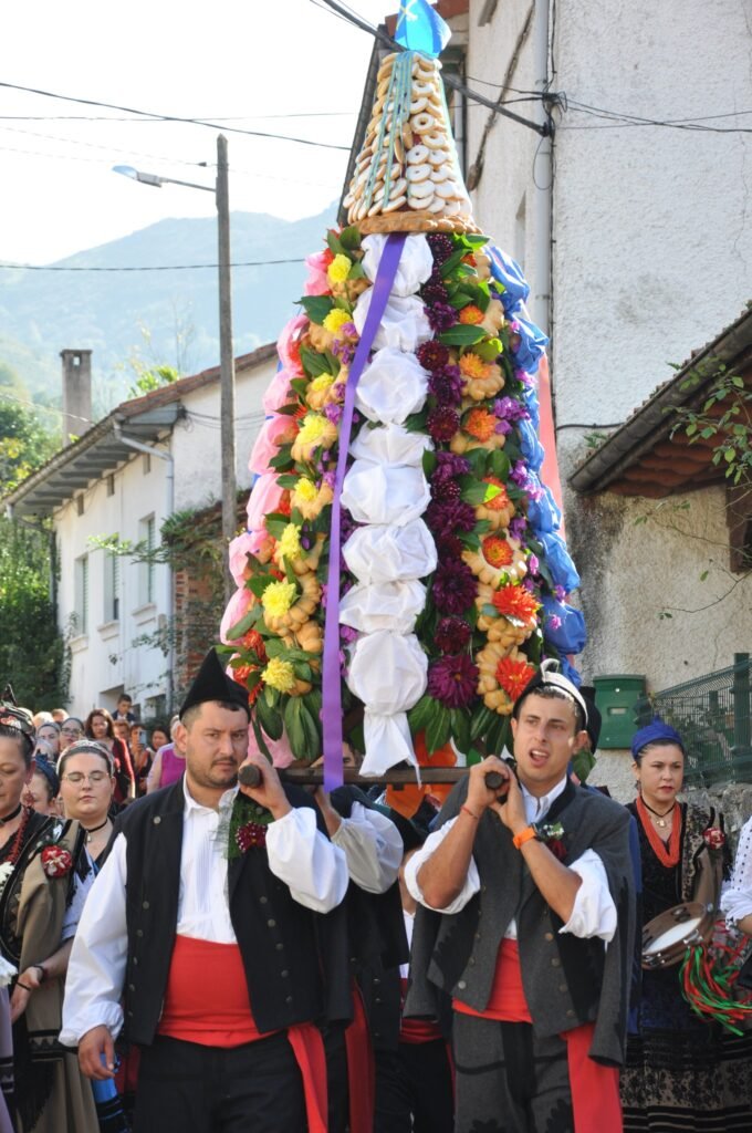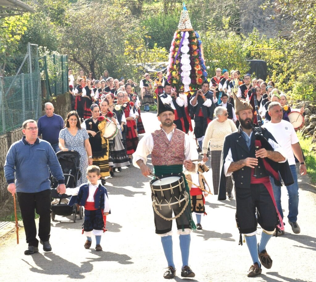 Desde La Teya se puso en marcha la comitiva folclórica camino a la iglesia parroquial, a la otra parte del pueblo. Marchaban por delante los gaiteros y a su estela circulaban dos largas filas de aldeanas, quienes escoltaban el ramo que salió a hombros de José Remis, Daniel Sánchez y los primos Ángel y Pablo del Hoyo.