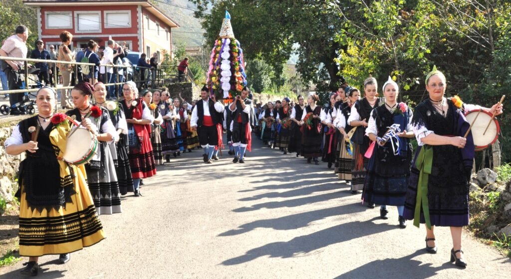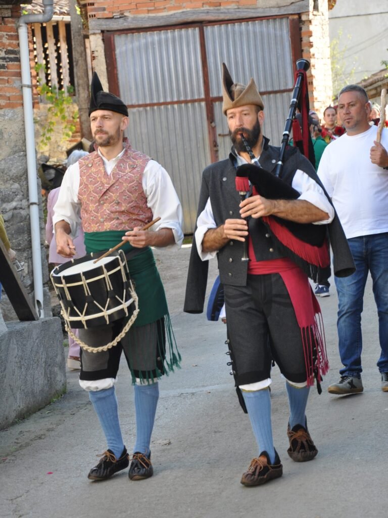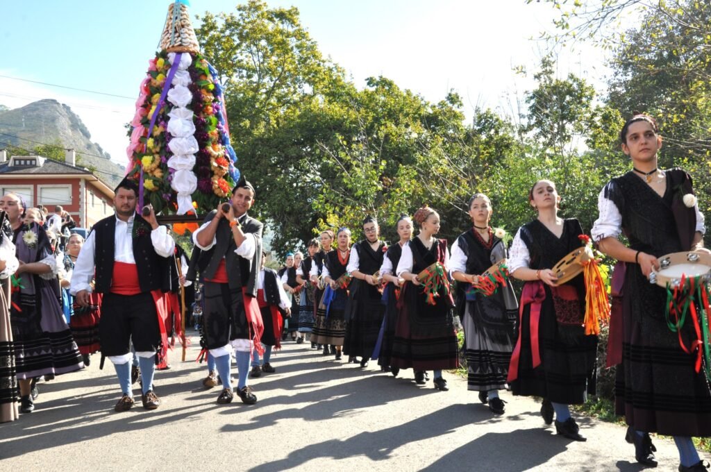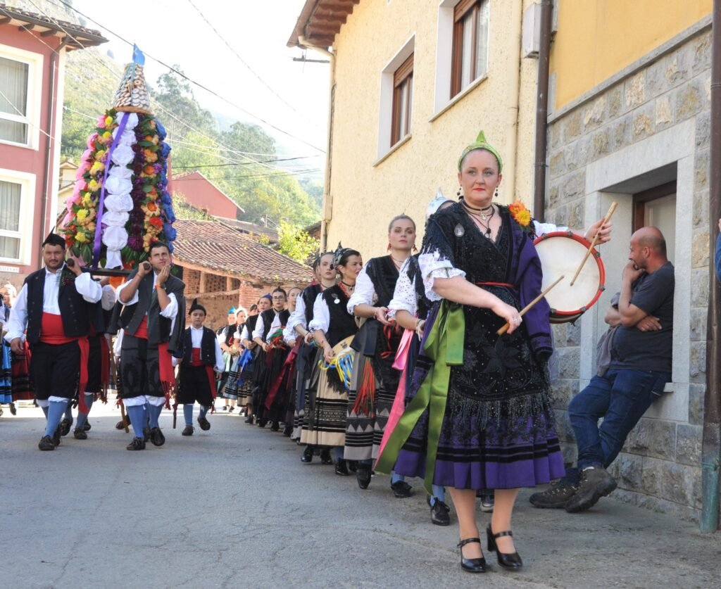 Más de medio centenar de niñas y mozas salieron a la calle vestidas de aldeana llanisca y superaban en dos decenas los hombres y niños enfundados en el traje de porruano. Antes de mediodía, los hermanos José y Ángel Rey, gaitero y tamboritero locales, ya habían anunciado con sus notas al aire lo que estaba por venir.