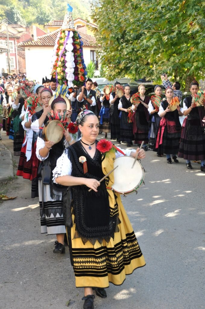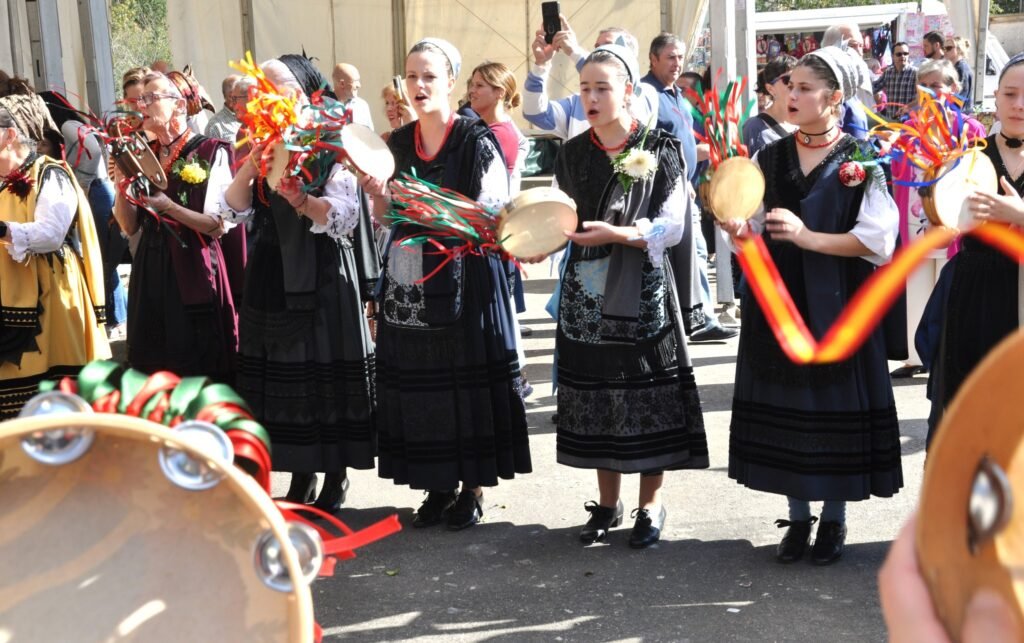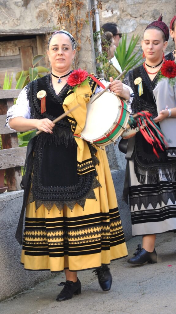 Las rapazas cantaban y tocaban la pandereta al compás de dos tambores que manejaban Beatriz Torga y Cristina Fernández Zapatero. Una vez en la plazuela de la iglesia, las mozas continuaron con sus cantares mientras se movían en circulo, de forma más colorida e impactante. El rito terminó en el interior del templo para regresar de nuevo a la calle e iniciar la procesión tras haber acoplado al cortejo las andas con la imagen de la Virgen del Rosario.