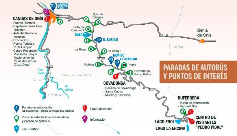 Quienes se decanten por esa opción deben dejar el coche en alguno de los aparcamientos habilitados y continuar desde esos puntos en el bus, con parada en los mismos espacios. Son: la estación de autobuses de Cangas de Onís, El Bosque, Muñigu y El Repelao.