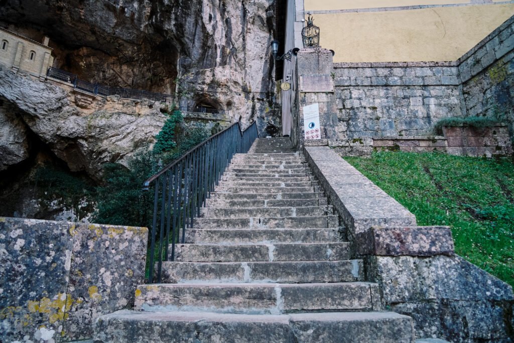 Al salir de la cueva, a la derecha, aparece una escalinata empinada. Son las escaleras de las promesas o del perdón, que bajan hacia la explanada del pozón. Lo suyo no es bajarlas, sino subirlas para cumplir con una promesa (de ahí su nombre). 103 peldaños que además es mejor subir de rodillas.