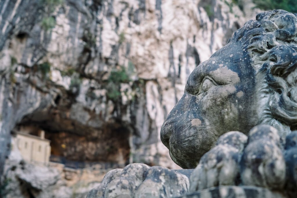 Bajo la colegiata y la cueva, dos leones de mármol de Carrara, réplica de los leones que custodian la tumba del papa Clemente XIII, velan por el acceso.
