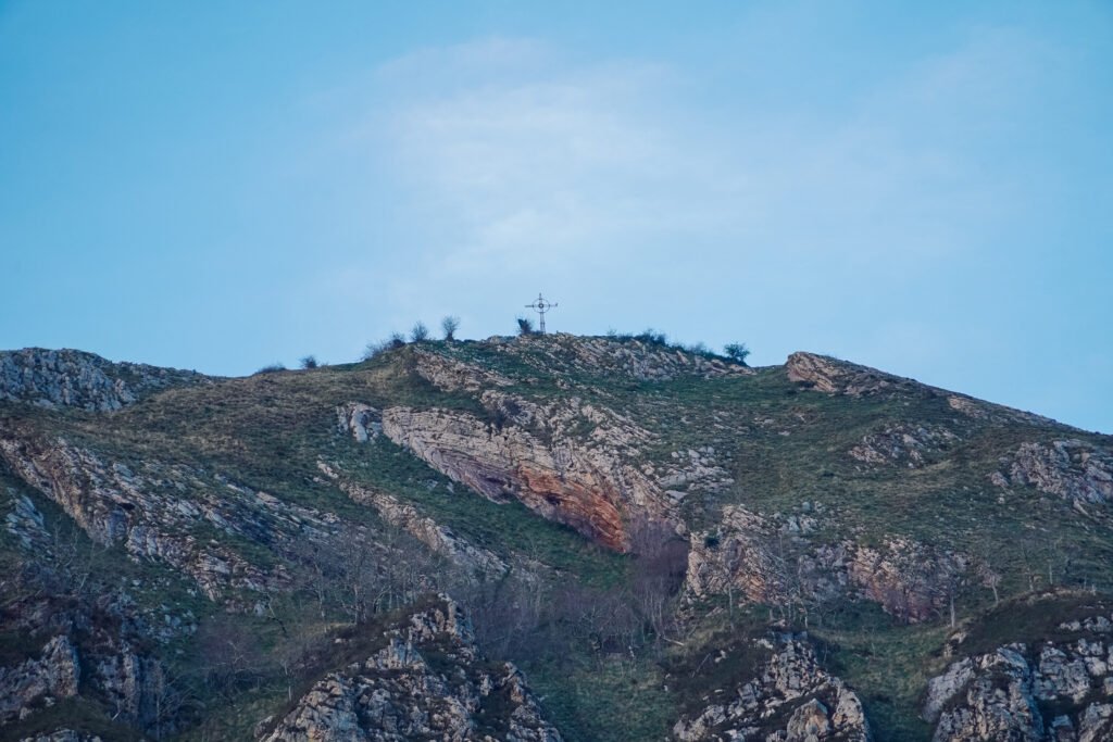 Tras la estatua se alza el Picu Priena, coronado por la Cruz de Pelayo. Desde ahí —dice la tradición— se preparó la emboscada.