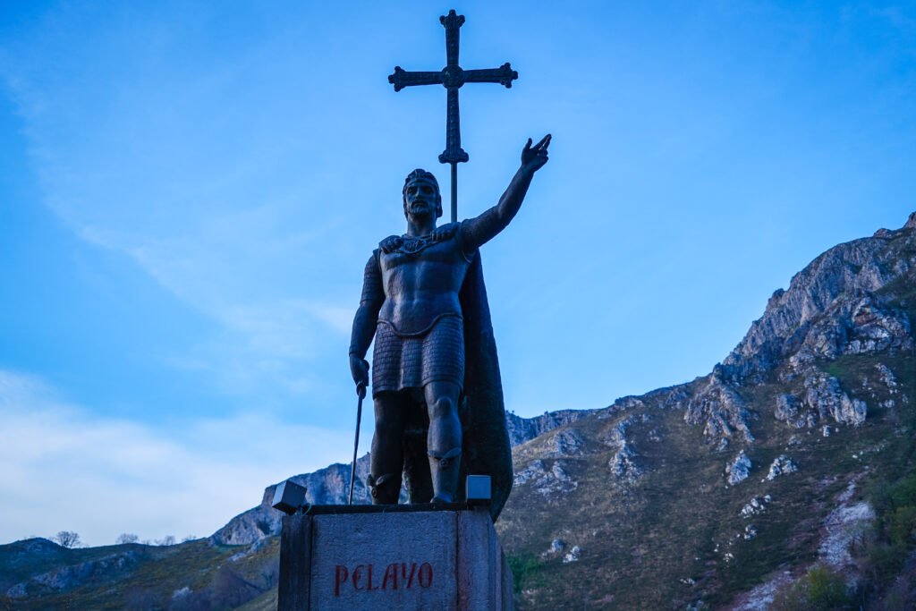En la explanada superior, la que se abre frente a la basílica, una figura vigila. Es la estatua de Pelayo, obra de Gerardo Zaragoza.