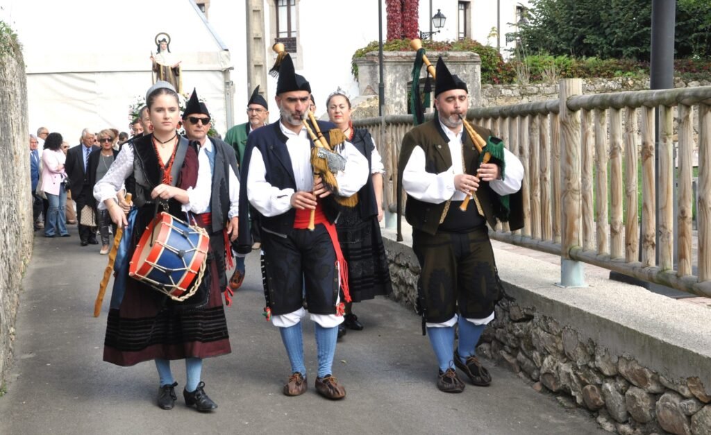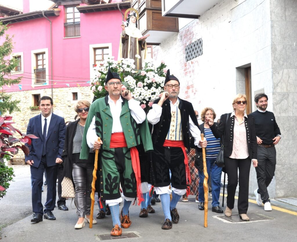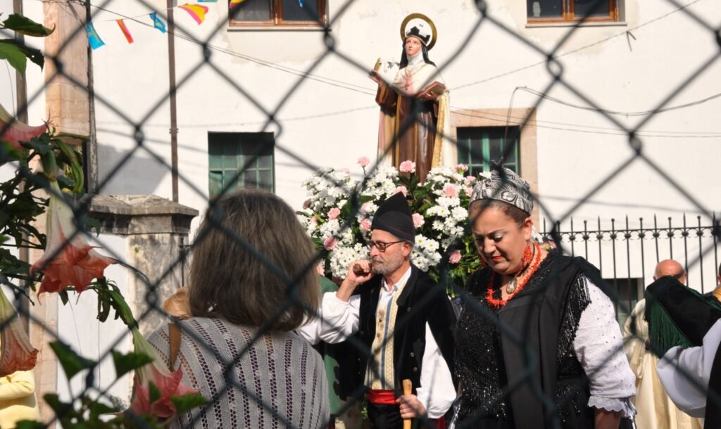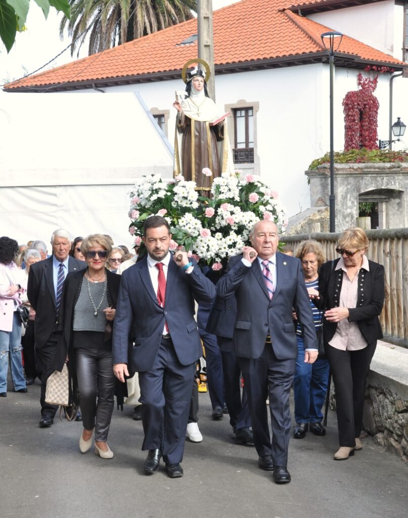 La recoleta capilla anexa a la vivienda principal acogió la misa oficiada por el párroco de Nueva, Domingo González. Y después de la eucaristía se formó una procesión en recorrido circular por las abarquilladas calles del centro de Nueva. Marchaba por delante la bandina de gaitas. Una decena de mozos de porruano y seis mozas de aldeana llanisca, abrían paso a las andas con la imagen de Santa Teresa, escoltada por un elevado número de devotos.