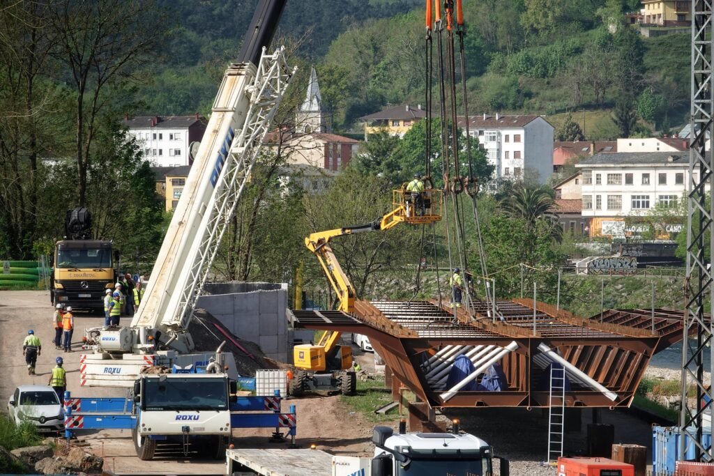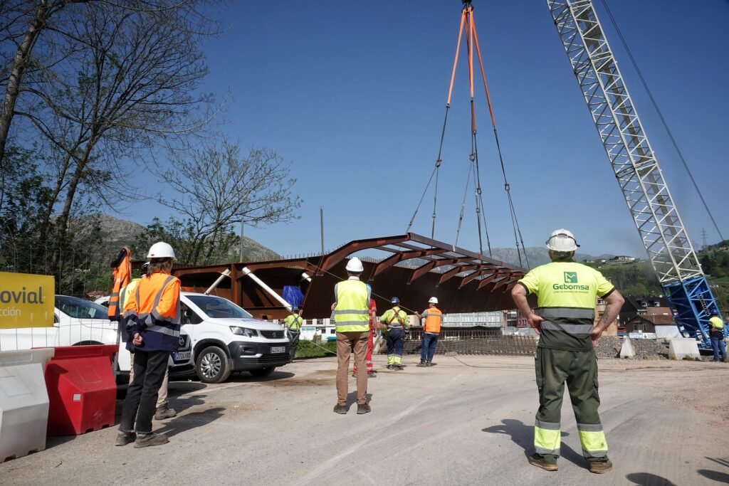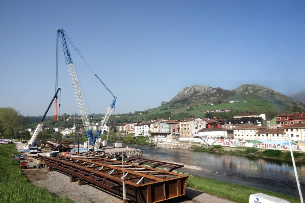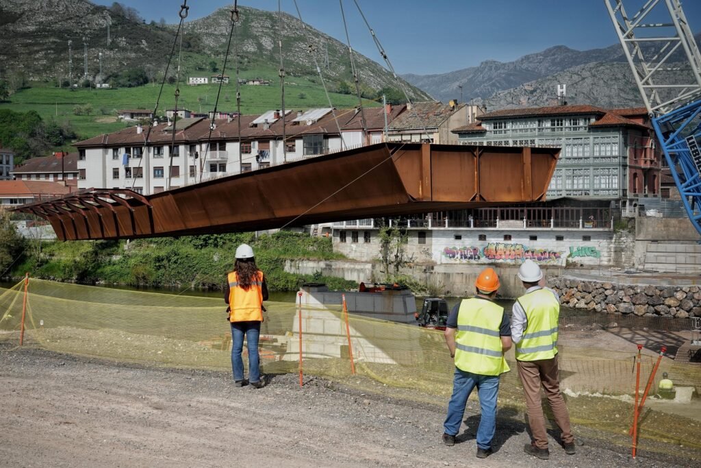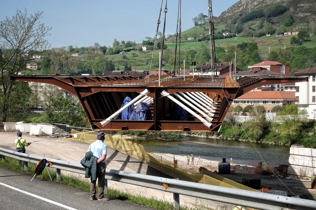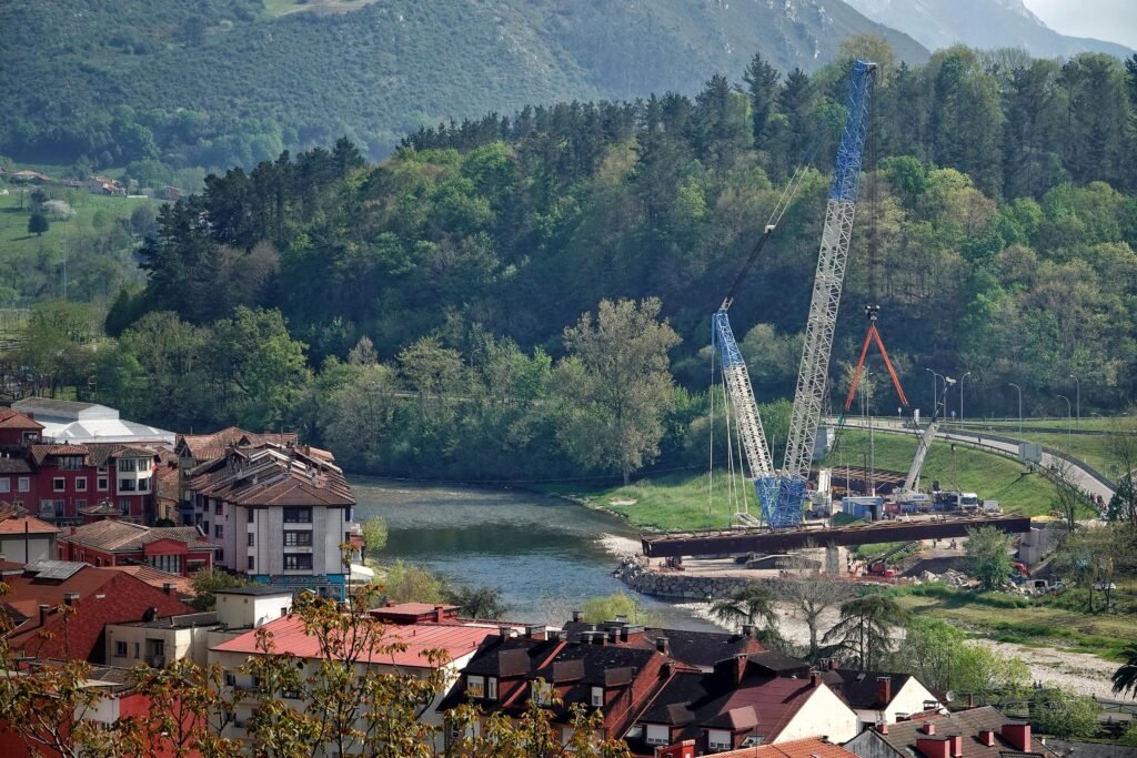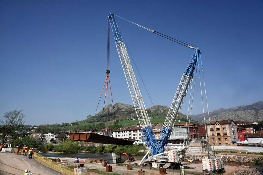 Y había mucho que mirar. Una grúa especial de 600 toneladas, visible desde buena parte de Arriondas, comenzó a izar las dos grandes vigas cajón metálicas que sostendrán el futuro tablero. Piezas de acero corten de 54,2 y 41,5 metros de longitud, y 190 y 100 toneladas de peso, respectivamente, que fueron elevadas desde la plataforma construida en la margen del río hasta su posición definitiva sobre los nuevos estribos.