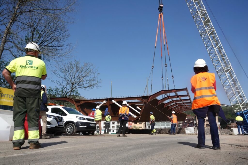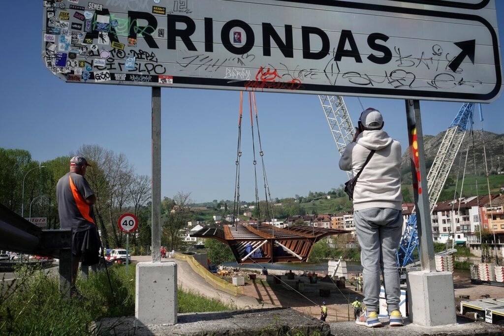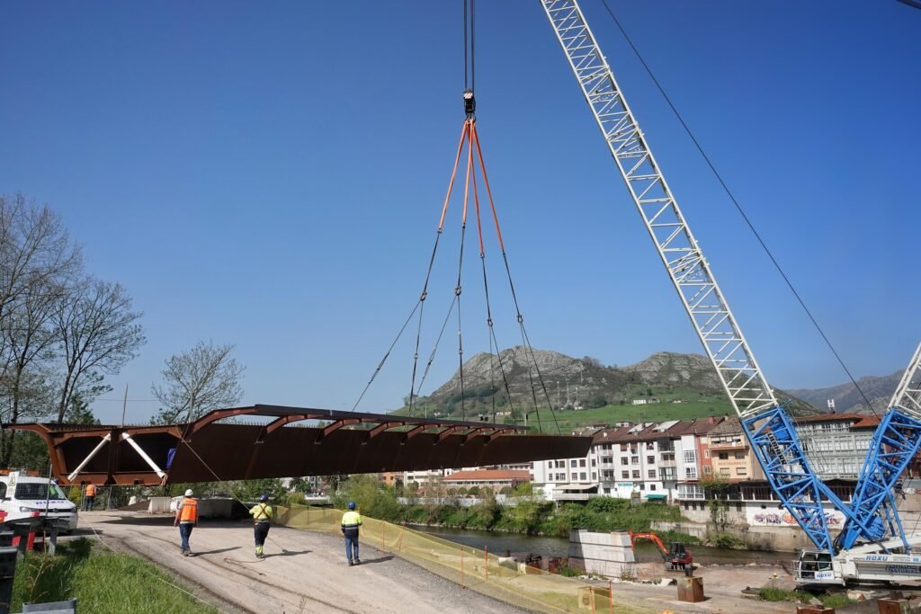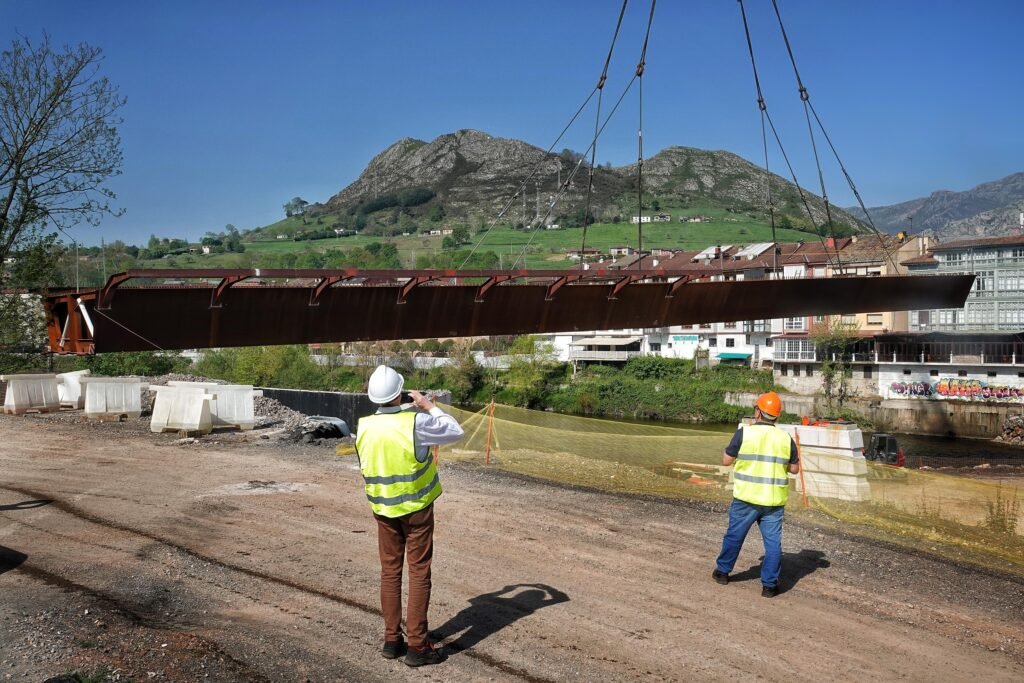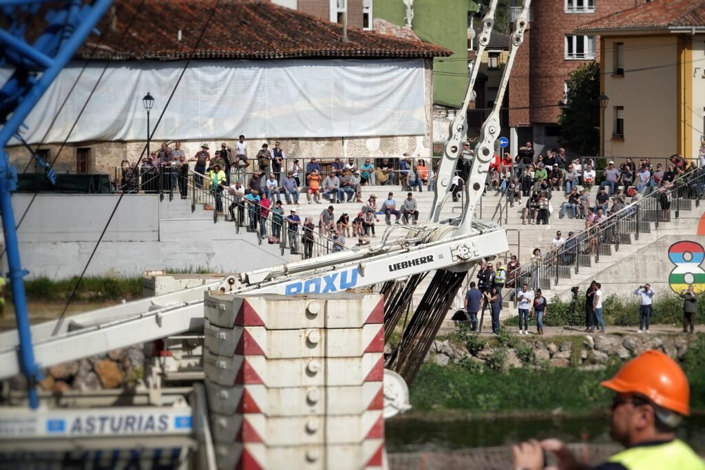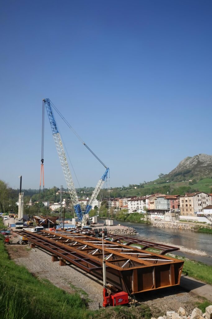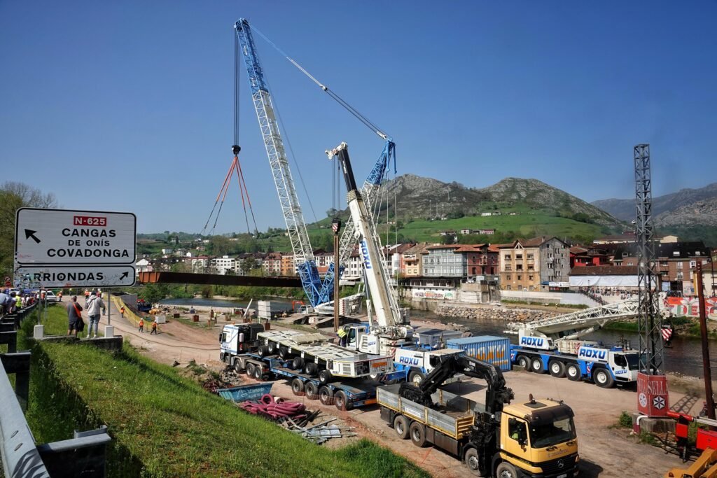 Y había mucho que mirar. Una grúa especial de 600 toneladas, visible desde buena parte de Arriondas, comenzó a izar las dos grandes vigas cajón metálicas que sostendrán el futuro tablero. Piezas de acero corten de 54,2 y 41,5 metros de longitud, y 190 y 100 toneladas de peso, respectivamente, que fueron elevadas desde la plataforma construida en la margen del río hasta su posición definitiva sobre los nuevos estribos.
