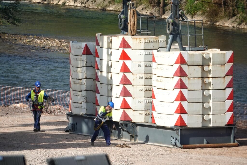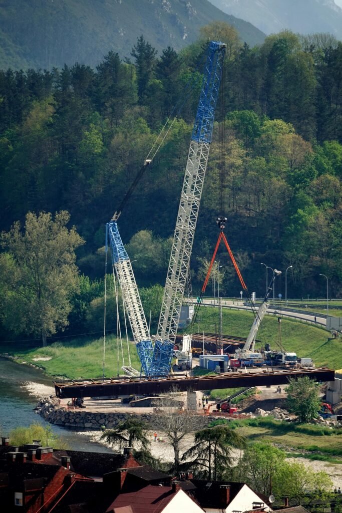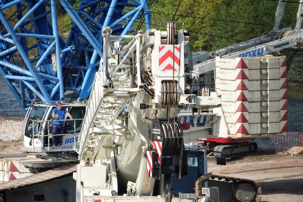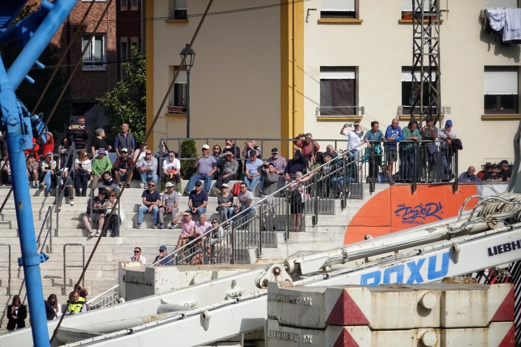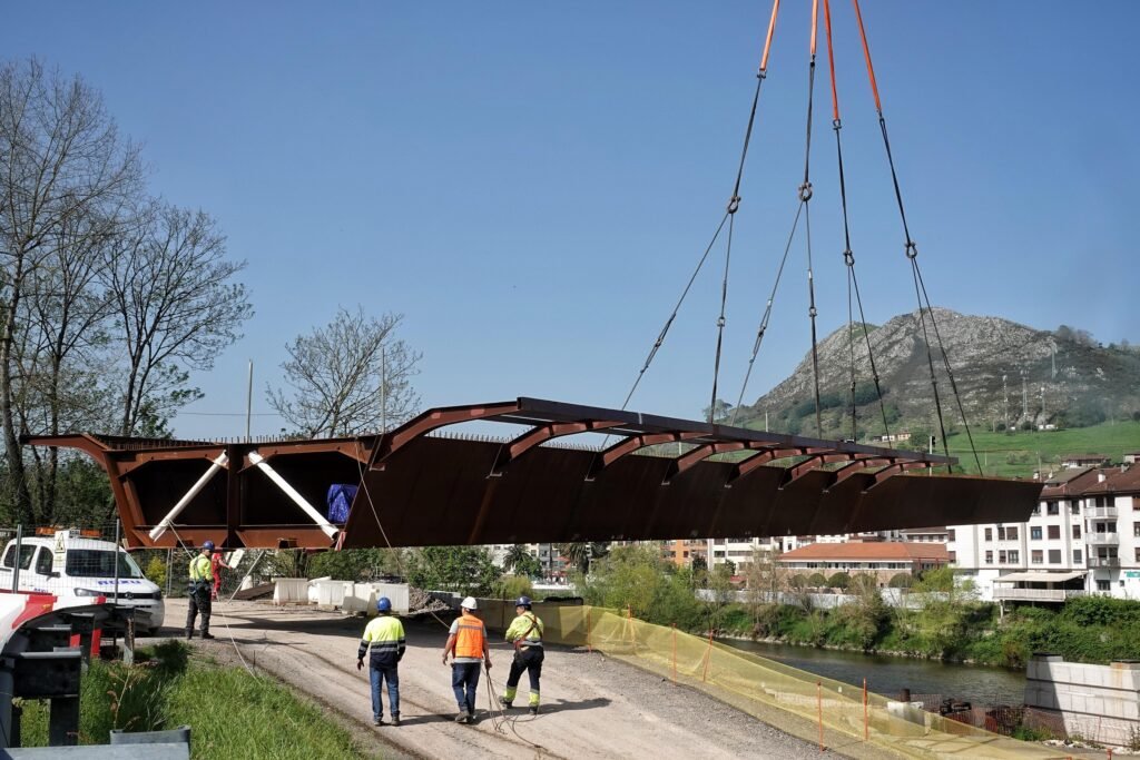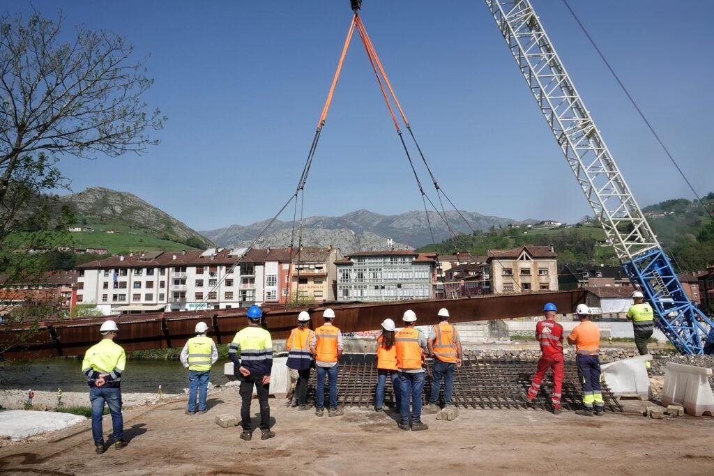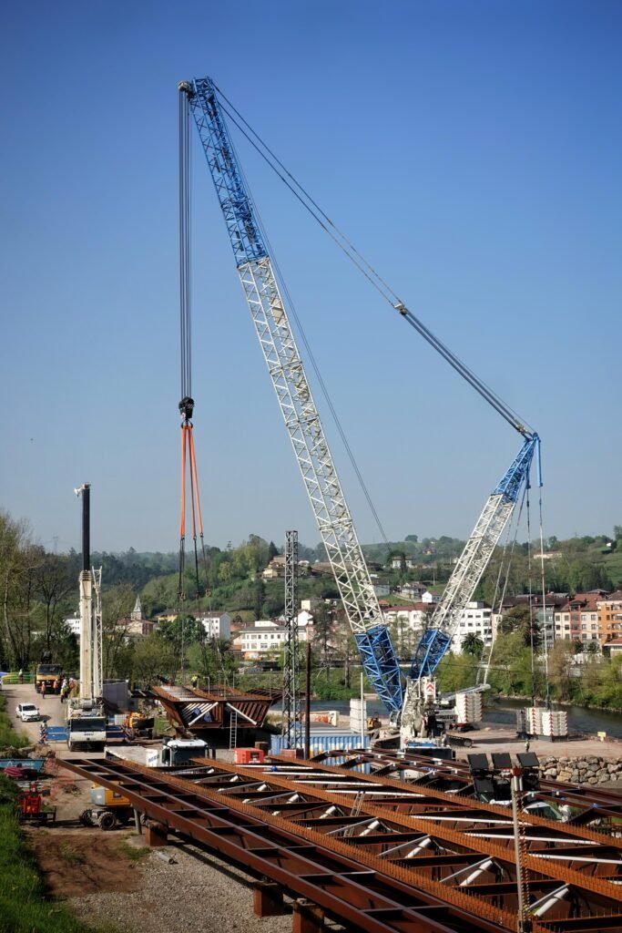 Y había mucho que mirar. Una grúa especial de 600 toneladas, visible desde buena parte de Arriondas, comenzó a izar las dos grandes vigas cajón metálicas que sostendrán el futuro tablero. Piezas de acero corten de 54,2 y 41,5 metros de longitud, y 190 y 100 toneladas de peso, respectivamente, que fueron elevadas desde la plataforma construida en la margen del río hasta su posición definitiva sobre los nuevos estribos.