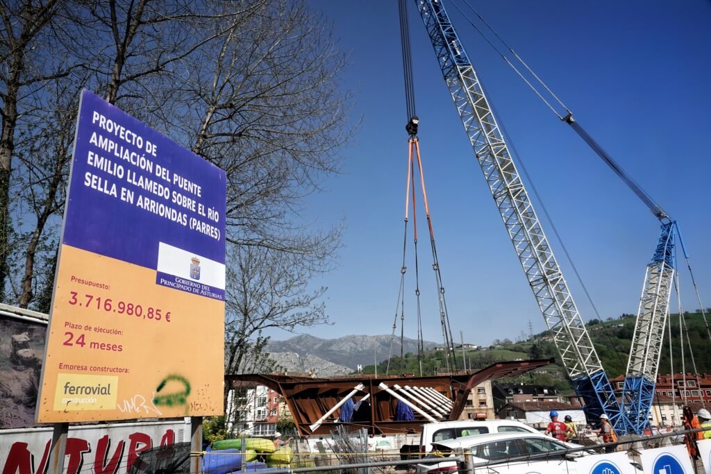 El izado de las vigas metálicas con una grúa de 600 toneladas marca el arranque del montaje del nuevo puente Emilio Llamedo, una obra clave sobre el río Sella que sustituirá a la histórica infraestructura y ampliará calzada, aceras y espacios peatonales