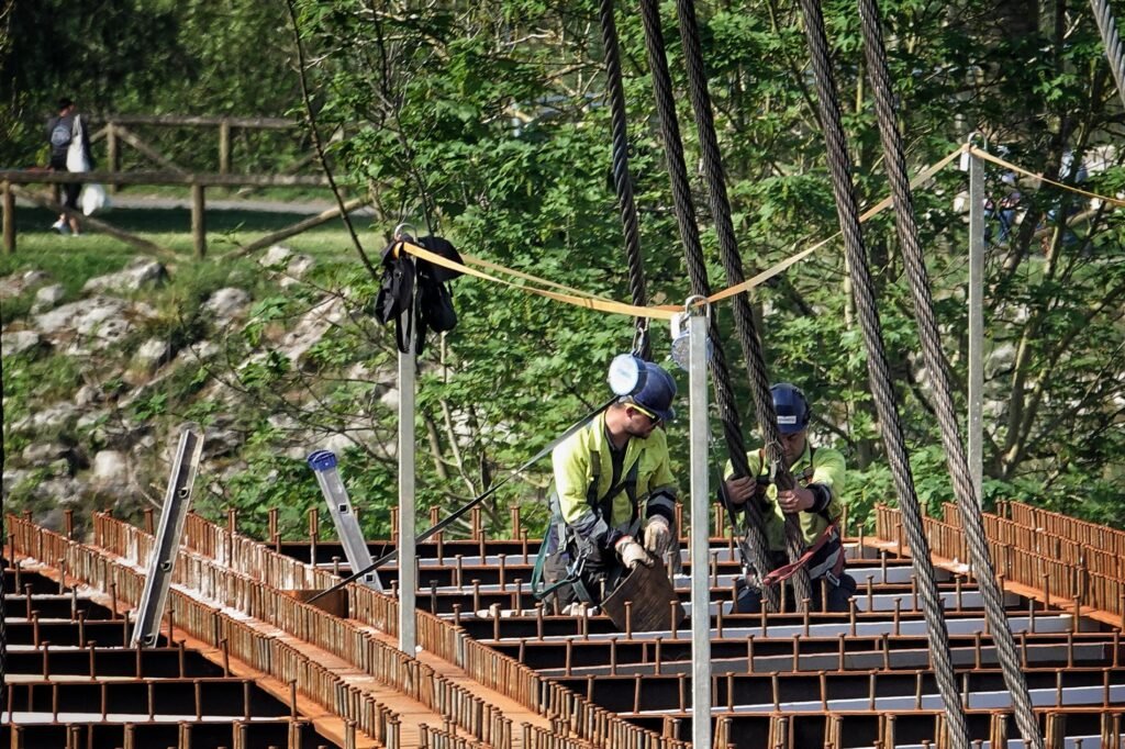 Tras la colocación de las vigas, los trabajos continuarán con la ejecución de la losa de hormigón armado que conformará el tablero. Las aceras, por su parte, se apoyarán en una estructura de costillas metálicas y contarán con vidrio de triple capa.