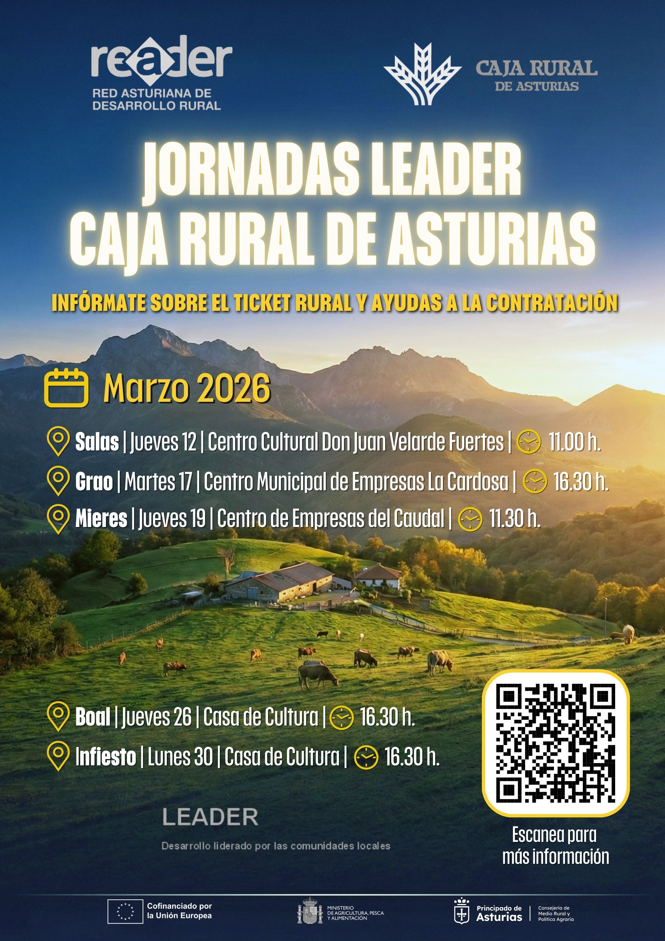 Jornada informativa LEADER 2026 en Boal Jornada informativa LEADER 2026 en Boal El jueves 26 de marzo, a las 16:30 h, la Casa de Cultura de Boal acogerá una charla informativa sobre la nueva convocatoria Leader 2026, organizada por la Red Asturiana de Desarrollo Rural y Caja Rural de Asturias. 🔎 En esta sesión se explicarán en detalle: ✔ Tique Rural ✔ Tique Asalariado (novedad de este periodo), una ayuda destinada a apoyar la contratación de personal y fomentar la creación de empleo. Una oportunidad muy interesante para personas emprendedoras y para proyectos, especialmente de los sectores agrario y ganadero, que necesiten incorporar mano de obra con el apoyo de los fondos Leader. 🤝 La jornada contará con la participación de las gerencias de los Grupos de Desarrollo Rural (GDR) y responsables de Caja Rural de Asturias, en el marco del convenio de colaboración que ofrece condiciones especiales a las personas beneficiarias. 📅 La convocatoria LEADER Tique Rural y Tique Asalariado está abierta desde el 17 de febrero y permanecerá activa durante dos meses. Imágenes
