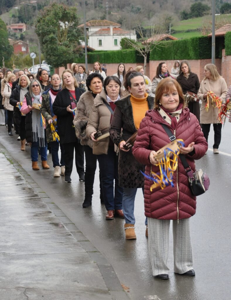 Encabezaba la comitiva la banda de gaitas L’Alloru, procedente de Balmori y dirigida por Julián Herrero ‘El Marineru’. Seguían los ocho ramos de pan y medio centenar de mujeres tañendo la pandereta al compás de dos tambores en manos de Priscila Alonso y Ana Sobrino. Del cortejo sacro formaban parte una jaula con dos palomas a hombros de cuatro niñas, la efigie del Niño Jesús de Praga y las andas con la imagen de la Virgen de la Candelaria, con una vela en la mano derecha y el Niño sentado en su regazo. El párroco, José París, y una legión de devotos y romeros cerraban la comitiva.
