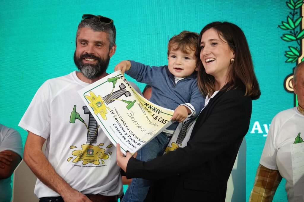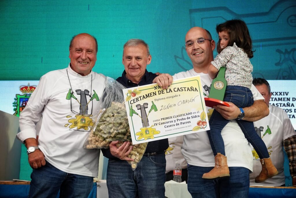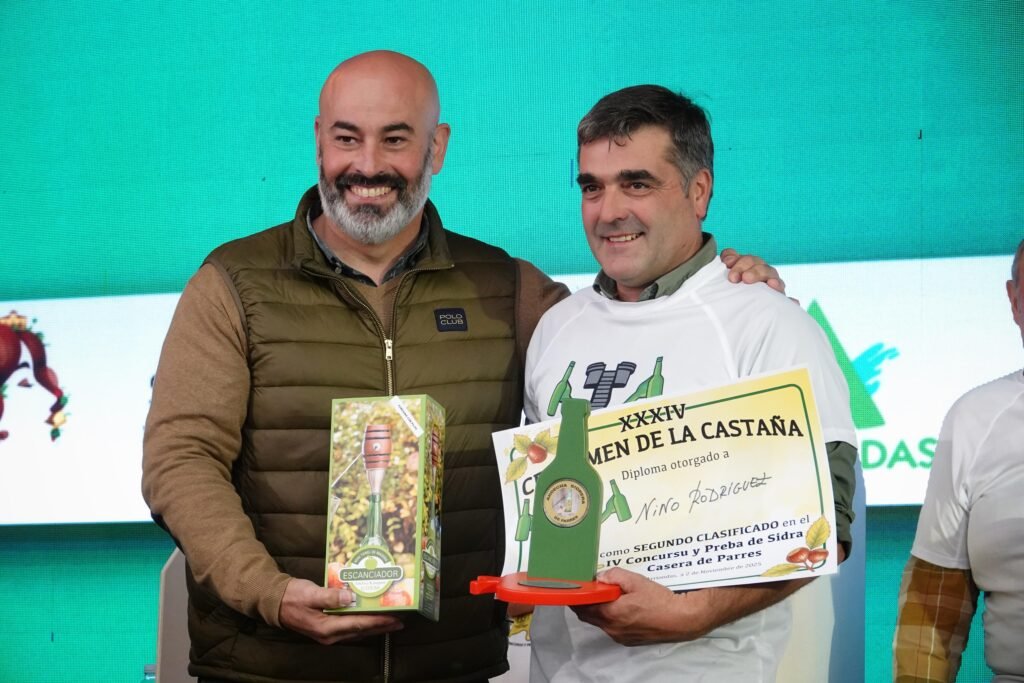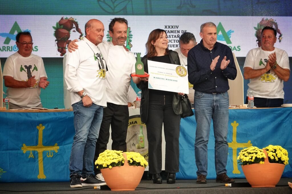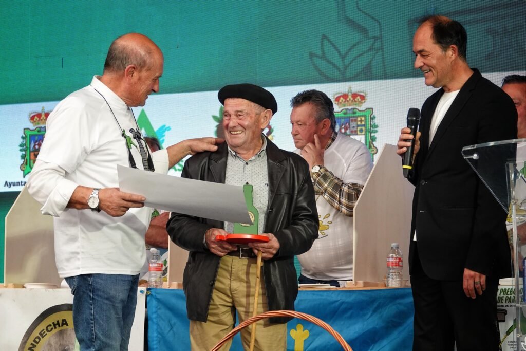 A eso de las tres de la tarde llegó el momento de los premios y reconocimientos. La Asociación Andecha Sidrera rindió un emotivo homenaje a Marcial Manzano, padre del chef Nacho Manzano (Casa Marcial), fallecido el pasado verano y gran amante de la sidra casera. El reconocimiento fue recogido entre aplausos por sus hijos, Esther y Nacho Manzano, visiblemente emocionados.