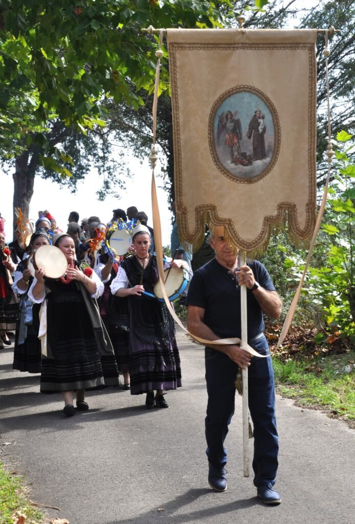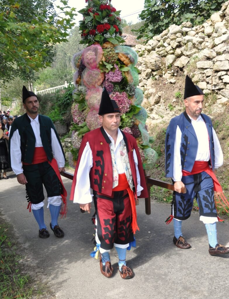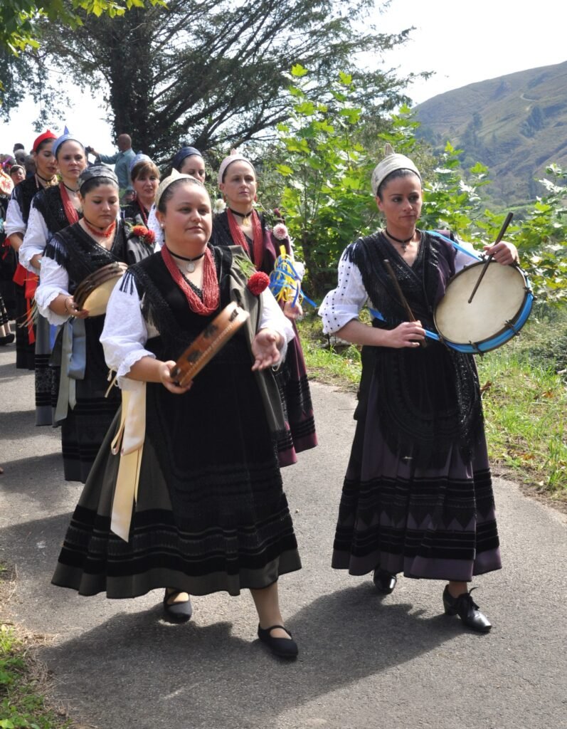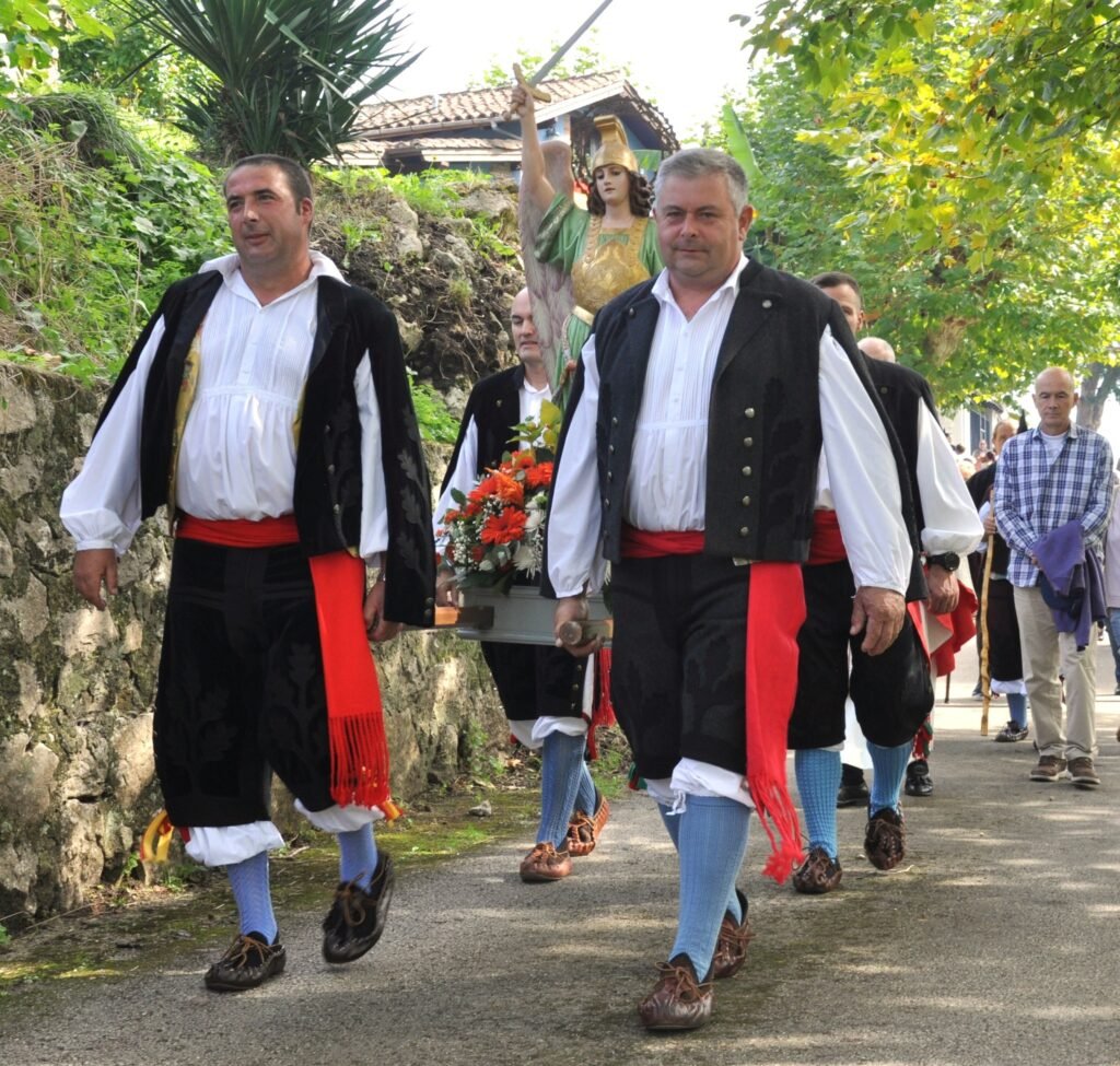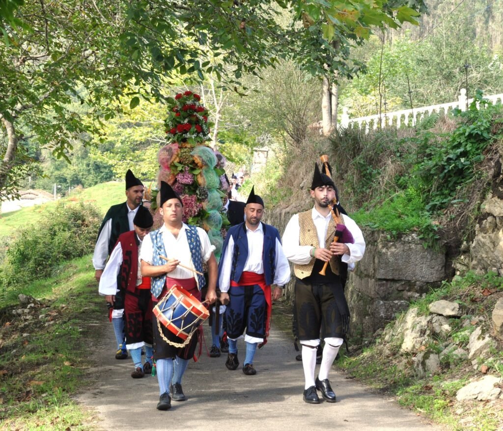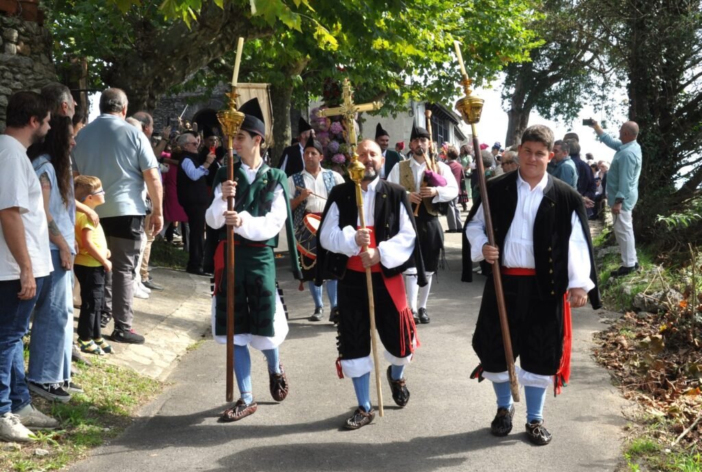 Una vez en la iglesia se formó la procesión que salió encabezada por tres muchachotes en el traslado de una cruz de plata y dos ciriales. Seguía la pareja de gaiteros y un vistoso ramo de pan artesanal en manos de Humberto Pérez, Pedro Piñera, Iván Asenjo y Santiago Zaragoza. Por detrás aparecía el estandarte del arcángel y dos decenas de mozas vestidas de aldeana llanisca, tañendo sus panderetas al contrapunto de un tambor que manejaba Ana Robles. Del traslado de las andas con la imagen de San Miguel se encargaron cuatro vecinos ataviados de porruano.