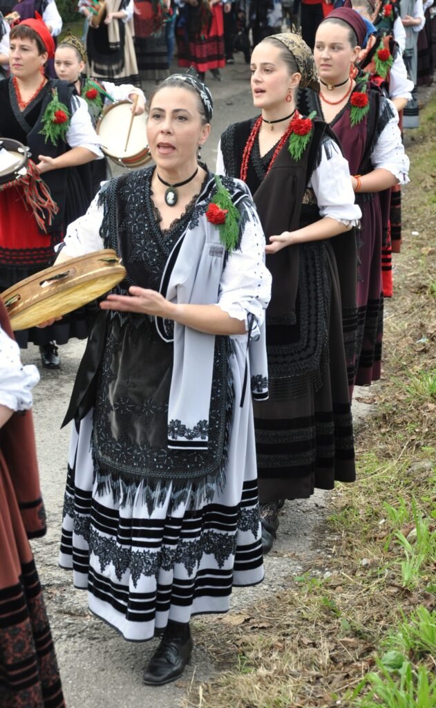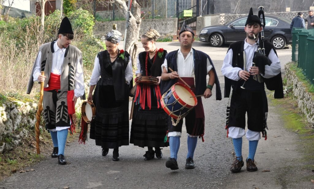 La comitiva folclórica, encabezada por Dani Ríos y Manolín Vela, se puso en marcha con rumbo a una carpa que hacía las veces de capilla. Por detrás marchaban los dos ramos, las niñas y rapazas de llanisca, una decena de varones de porruano y una nutrida representación de curiosos, visitantes y vecinos.