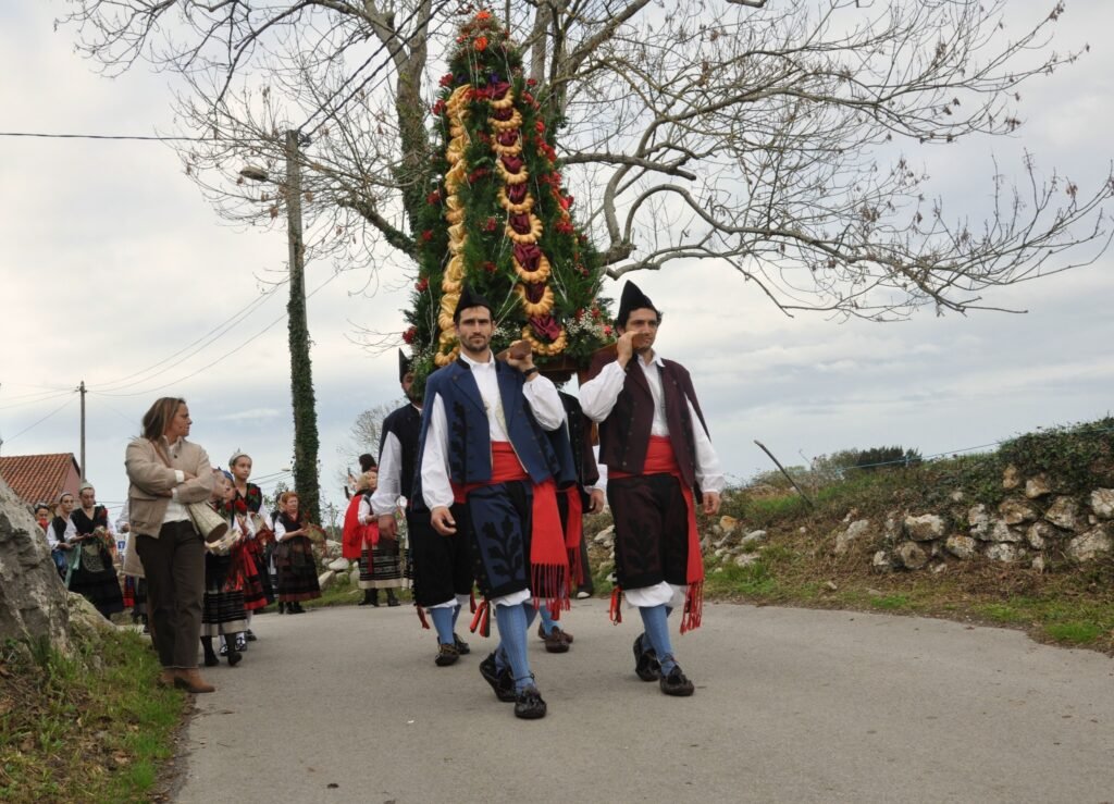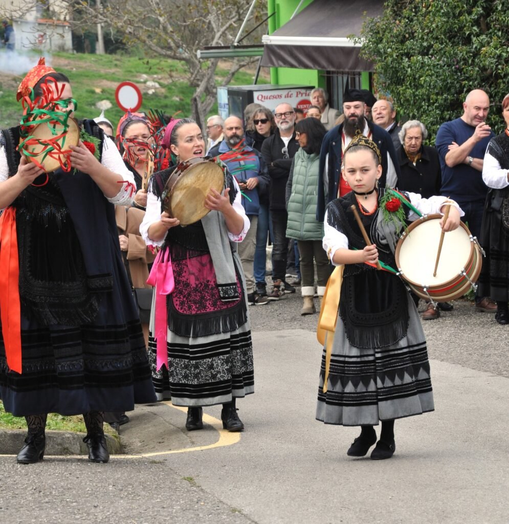 La mañana se inició con un breve pasacalles a cargo del gaitero Dani Ríos, llegado desde Villahormes, y el tambotirero Manolín Vela, procedente de Poo. Mozas ataviadas de llanisca, galanes de porruano y público de la más variada procedencia se dirigieron a la finca de La Pomarada, lugar de salida de dos vistosos ramos: uno de rosquillas dulces a hombros de los guajes y otro de pan artesanal trasladado por los veteranos.