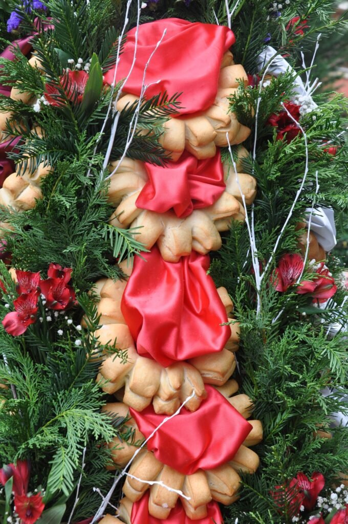 Por las calles del pueblo llanisco procesionaron dos vistosos ramos: uno de rosquillas dulces a hombros de los guajes y otro de pan artesanal trasladado por los veteranos
