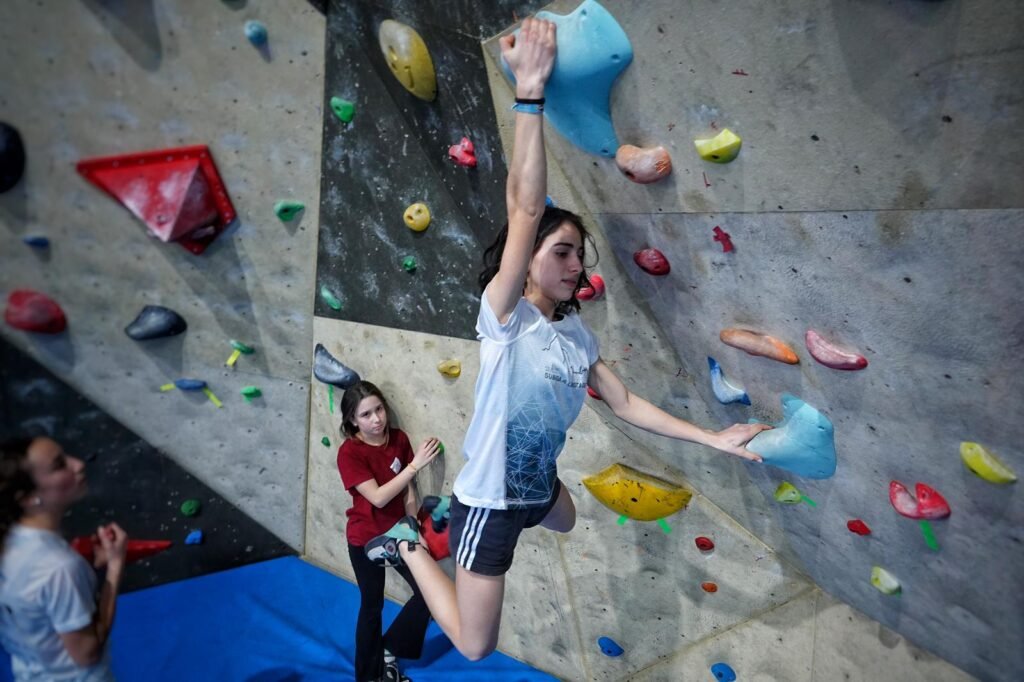 Hemos quedado con ella en el rocódromo de Arriondas, interrumpiendo durante un rato uno de sus entrenamientos con el Club de Escalada El Sueve. El espacio —amplio, bien equipado y muy vivo— es ya un pequeño referente en la zona. Y no es casualidad. Hace más de cinco años, la llegada de su entrenadora, María Saro, impulsó las clases de escalada en el polideportivo. La acogida fue tan buena que hoy hay lista de espera. Sandra se apuntó desde el primer año. Desde entonces no ha dejado de entrenar.